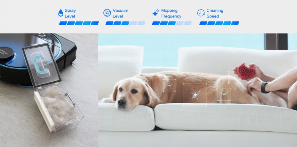 Množství vody, kterou robot dávkuje na čištěnou podlahu, je kontrolováno systémem AI Smart Spray. Díky tomu je množství dávkované vody ideální pro všechny typy hladkých podlah. Množství vody se reguluje v závislosti na teplotě, rychlosti odpařování vody a oblasti čištění. Po vytření zůstane na čištěné podlaze minimální množství vody.