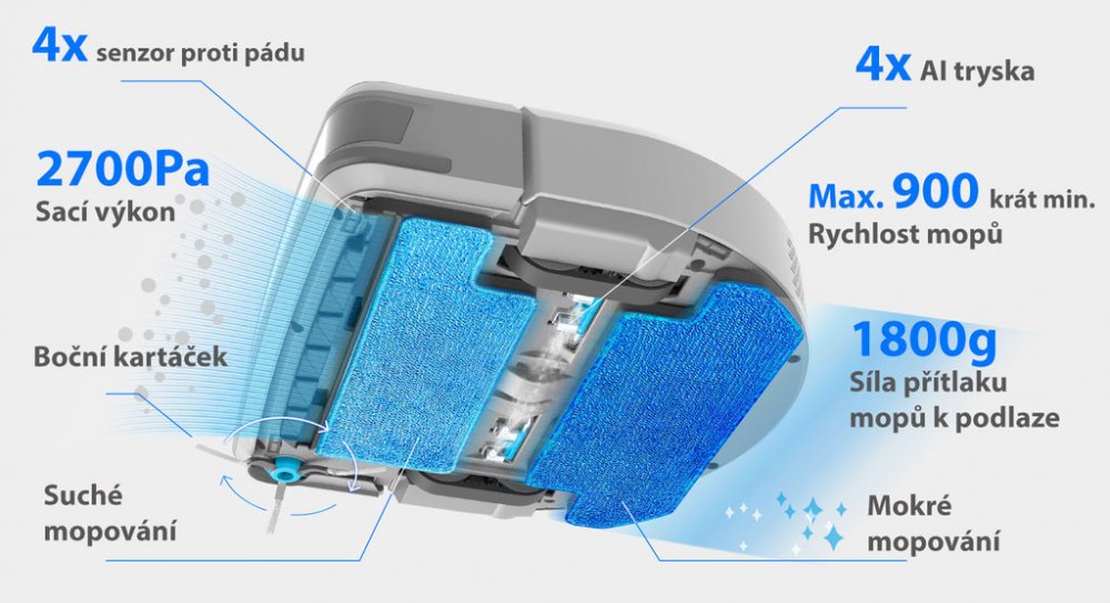 Komplexní úklid hladkých podlah v jednom kroku – vysávání, suché mopování, automatické dávkování vody a mokré mopování. Výkonné sání v přední části vysavače vysaje veškeré větší nečistoty, vlasy a zvířecí chlupy. Suchý mop kmitá po podlaze a stírá jemný prach, 4 speciální trysky dávkují vodu na uklízenou podlahu a druhý kmitající mop setře a vyleští podlahu pomocí vody.