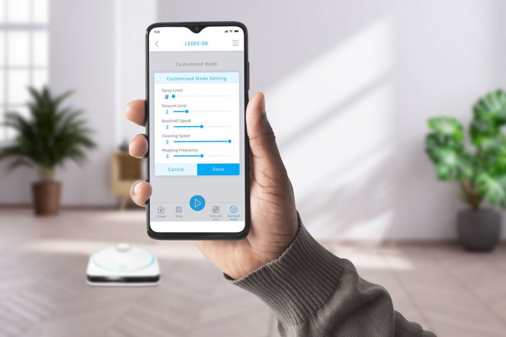 LEGEE D8 můžete komfortně ovládat pomocí aplikace v českém jazyce, sledovat úklid v reálném čase, plánovat úklid, uložit až 5 map do paměti, vytvářet virtuální bariéry a zakázané oblasti. Můžete editovat inteligentní rozvržení pokojů a vybrat si jeden z 8 talentových režimů úklidů. Umožňuje aktualizaci firmaware LEGEE pomocí technologie OTA. Aplikace je k dispozici pro iOS a Android zdarma.