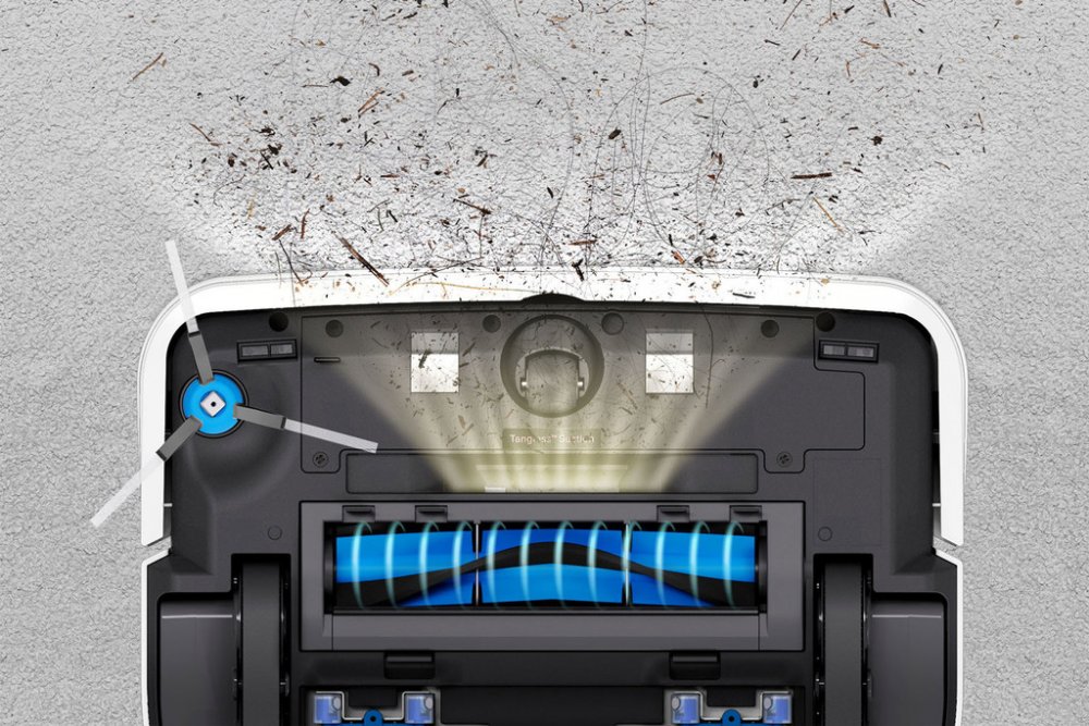 Výkonné sání Tangless™ s výkonem 5000Pa vysaje z podlahy 82 % nečistot před hlavním kartáčem jako vlasy, zvířecí chlupy a prach, které zabrání jejich namotaní do hlavního kartáče. Zbývající nečistoty vysaje z podlah hlavní kartáč se zadním nasáváním.
