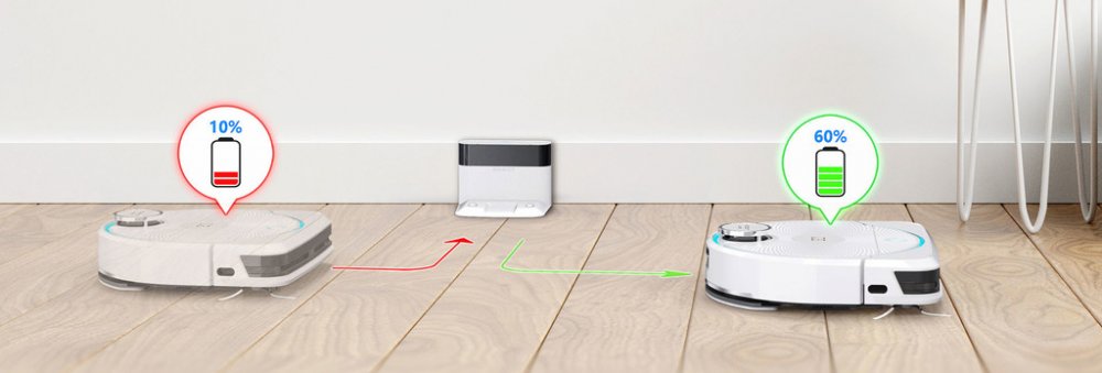 Když je baterie téměř vybitá, LEGEE se automaticky vrátí do nabíjecí základny, odhadne požadovanou kapacitu baterie pro zbývající oblast úklidu a po dostatečném nabití baterie dokončí úklid.