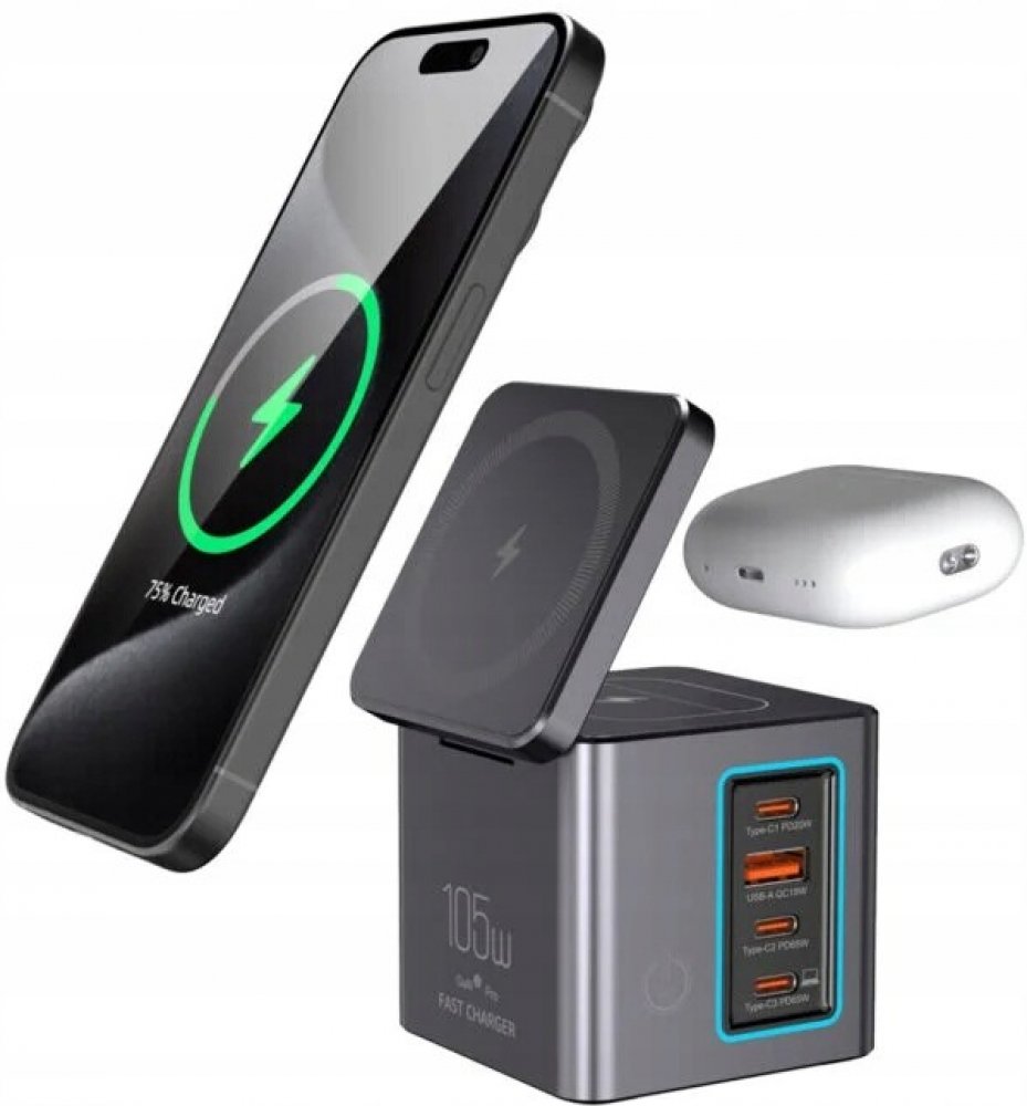 - Kompatibilní s: iPhone 12/13/14/15/16 série (MagSafe); Apple Watch Ultra 2 / Ultra / SE / 8 / 7 / 6 / 5 / 4 / 3 / 2 a novější; AirPods Pro 1/2, AirPods 2/3 a další modely s pouzdro