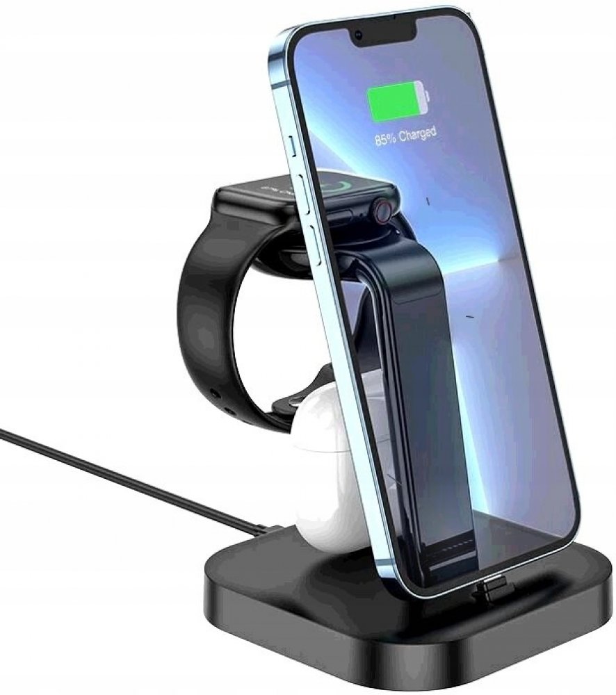 HOCO CW43 bzedrátová / stolní Apple nabíječka 3v1 / sluchátka, hodinky, telefon - černá.