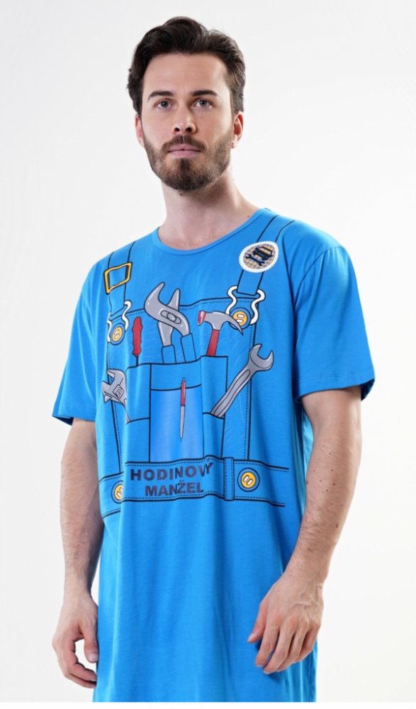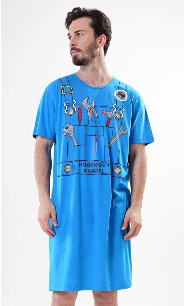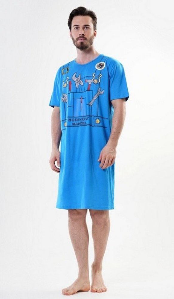Pánská noční košile s krátkým rukávem Hodinový manžel. Pánská noční košile pro všechny milovníky pohodly s vtipným potiskem imitujícím monterky s nářadím. Použitý materiál je jemný a poddajný na dotek. Pokyny pro údržbu: