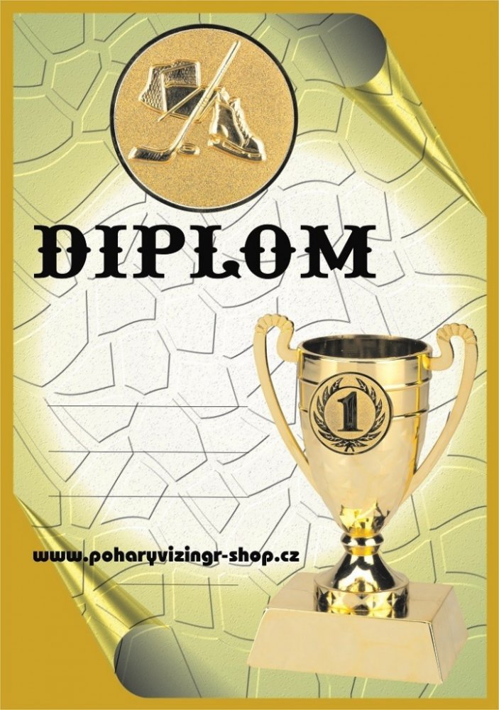 Hokej č.44. Diplom formátu A4 (250 g). Objednáváte NEVYPLNĚNÉ (BEZ TEXTU) diplomy a chcete si je vyplňovat vlastní tiskárnou - napište do textu "BEZ LINEK". Objednáváte diplomy VYPLNĚNÉ - krátké a stejné texty napište zde. Požadujete-li dlouhé nebo různorodé texty napište je prosím ve svém PC a vložte soubor (např.PDF,Corel,WORD,Exel apod.) před uzavřením objednávky jako přílohu. Do diplomu lze vložit i Vaše logo, foto apod. - pro realizaci je vhodné konzultovat e-mailem v jakém formátu požadované logo máte k dispozici.Vyplněné diplomy(četná uznání, pamětní listy apod.) Vám i zalaminujeme - vhodné domluvit na prodejně. -