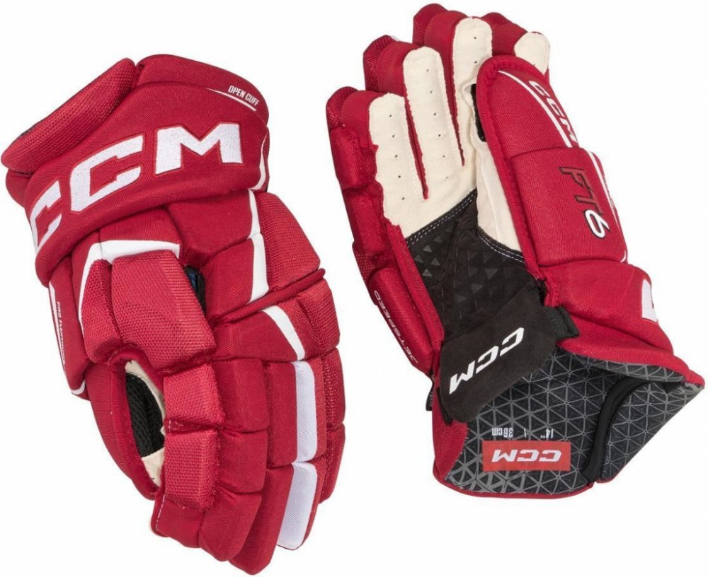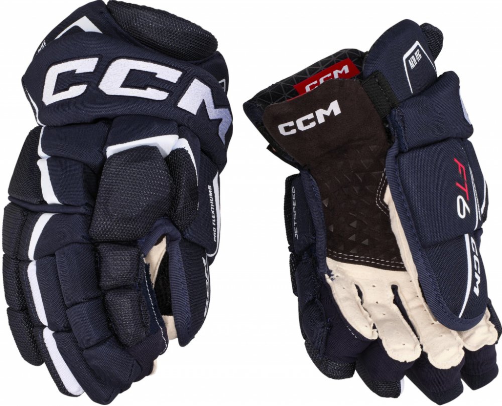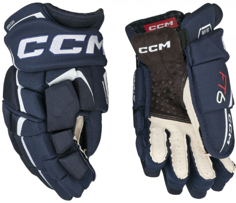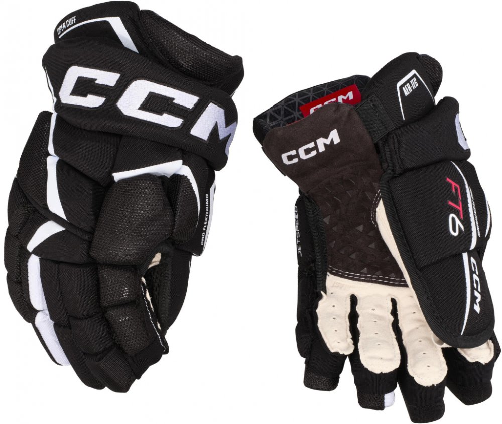 Špičkové komfortní rukavice CCM z nejnovější řady JETSPEED. Rukavice CCM JETSPEED FT6 jsou druhý nejvyšší model řady JETSPEED. Rukavice ze špičkového materiálu na úrovni profi TOP modelu, s extra zesílenou dlaní. Zajišťují skvělou úroveň ochrany díky ochranné PE pěně s vloženými plastovými díly a zároveň dovolují hráči skvělou pohyblivost v zápěstí. V neposlední řadě mají velmi atraktivní design.