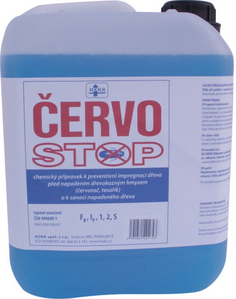 Chemický přípravek k preventivní impregnaci dřeva před napadením dřevokazným hmyzem (červotoč, tesařík) a k sanaci napadeného dřeva. Ošetření dřeva je dlouhodobé až trvalé, přípravek se ve dřevě nerozkládá. ČERVOSTOP® je výhodný pro preventivní ochranu zejména dřevěných staveb vč. trámů vazby a krovů, podlah, nábytku, dřevěných obkladů, ale je účinný i pro sanační ošetření dřeva již napadeného dře...