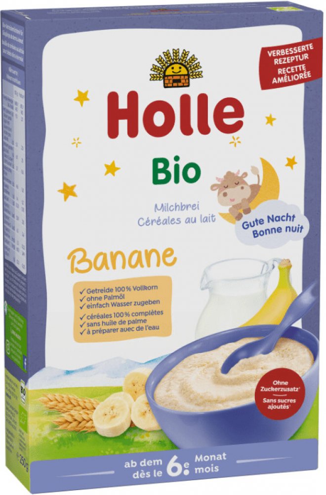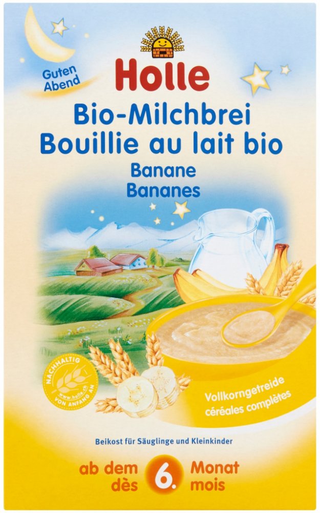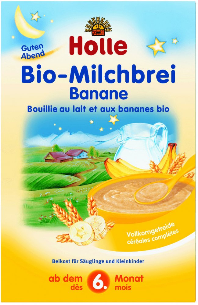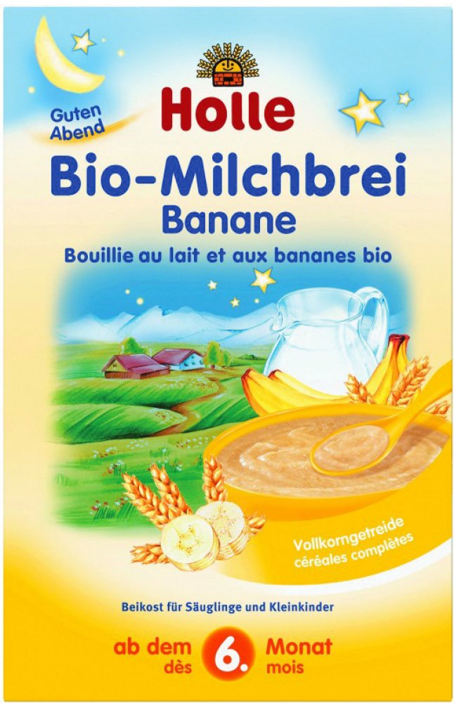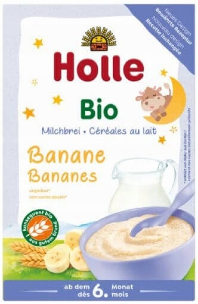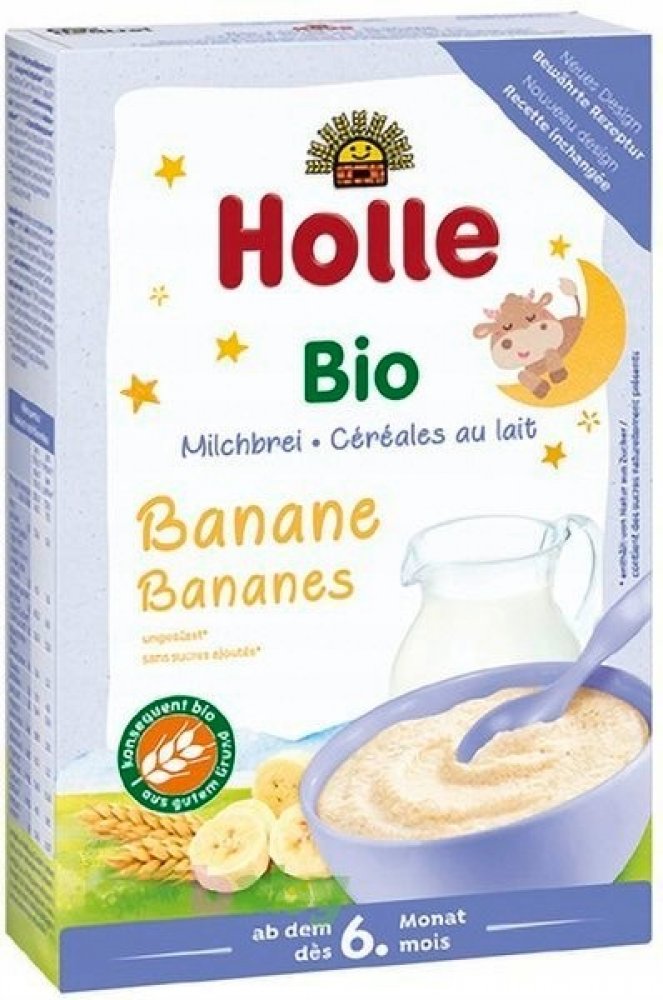 HOLLE BIO Banánová mléčná kaše 250g. Banánová mléčná kaše Holle je vhodná pro kojence a malé děti od 6. měsíce. Kaše neobsahuje přidaný cukr, ale díky prášku ze sušených banánů vašemu dítěti jistě rychle zachutná. Příprava je velmi jednoduchá, stačí vmíchat do horké vody a nechat vychladnout. Můžete kaši doplnit i čerstvým ovocem nebo ovocnou přesnídávkou.