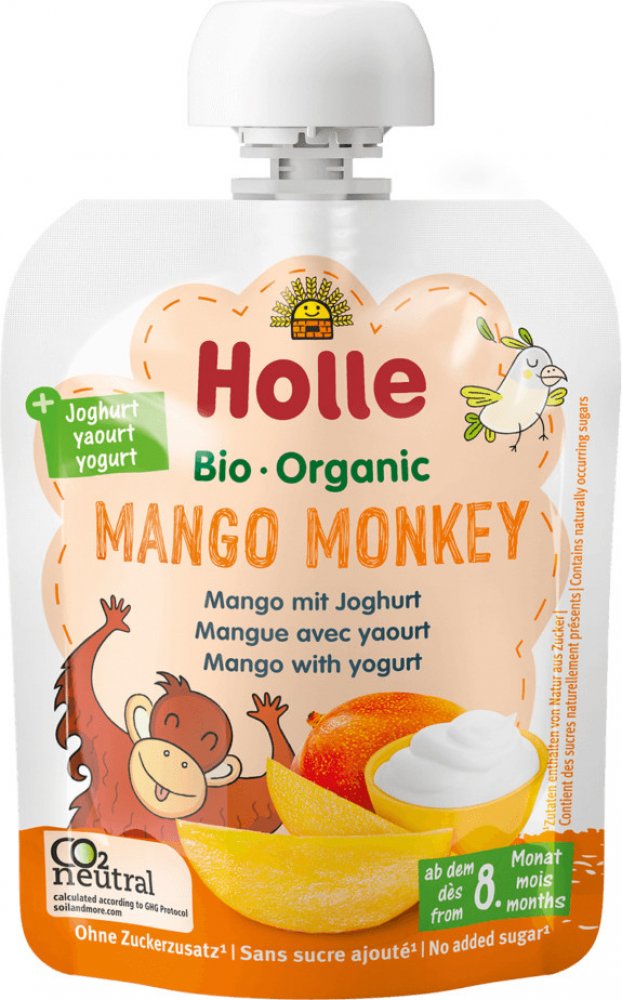 HOLLE Mango Monkey - BIO Dětské ovocné pyré s jogurtem 85 g BIO ovocná kapsička s jogurtem pro kojence a malé děti od 8. měsíce. Má Demeter kvalitu. Je bez přídavku barviv, konzervantů, aromat a zvýrazňovačů chuti, přídavku soli, přídavku cukrů, obsahuje přirozeně se vyskytující cukry.