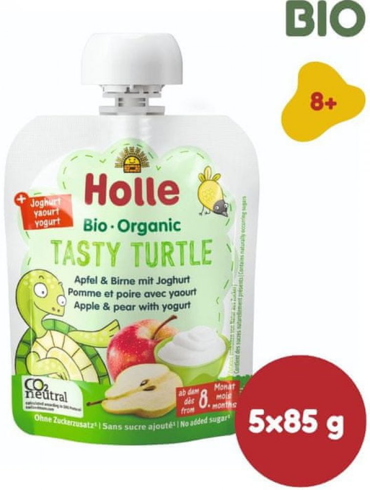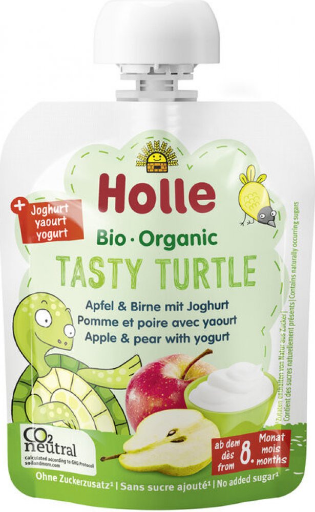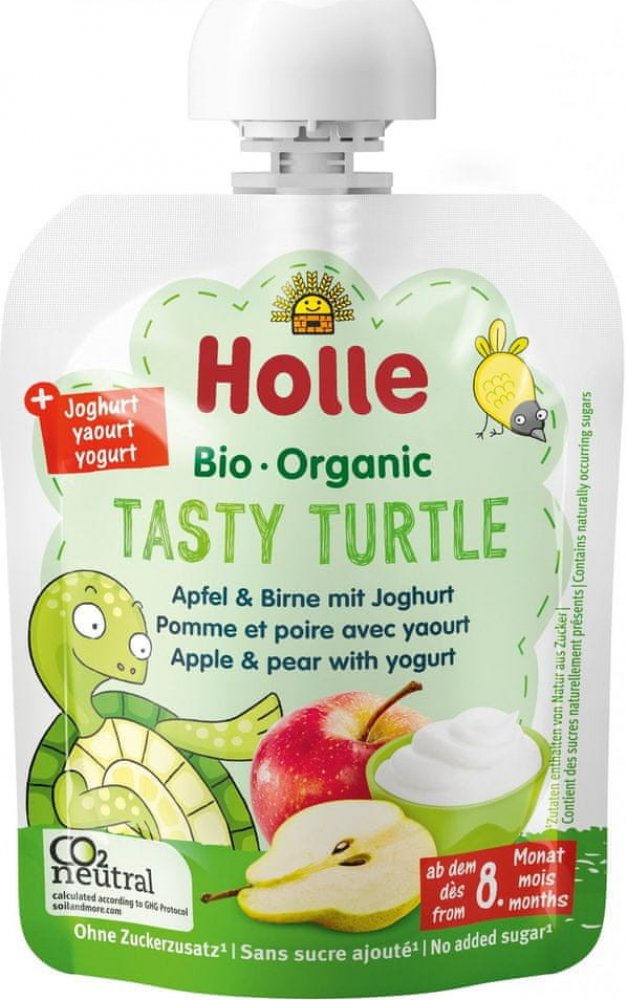 HOLLE Tasty Turtle - bio dětské ovocné pyré s jogurtem 85 g BIO ovocná kapsička s jogurtem pro kojence a malé děti od 8. měsíce. Má Demeter kvalitu. Je bez přídavku barviv, konzervantů, aromat a zvýrazňovačů chuti, přídavku soli, přídavku cukrů, obsahuje přirozeně se vyskytující cukry.
