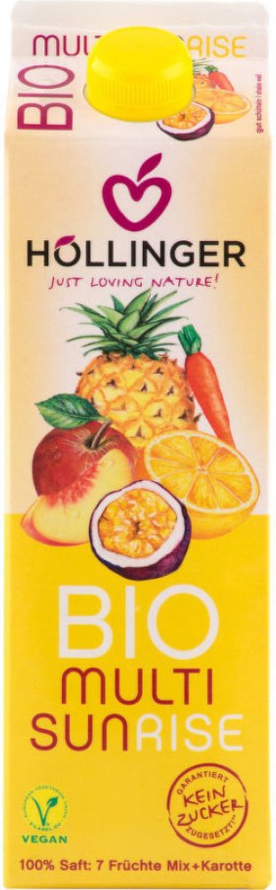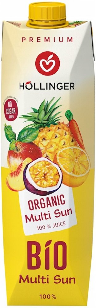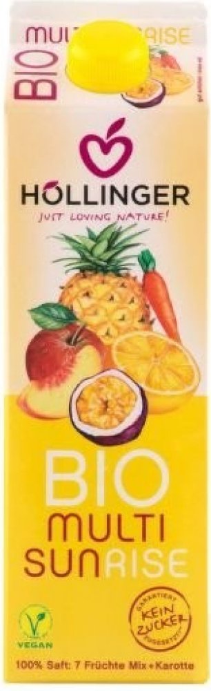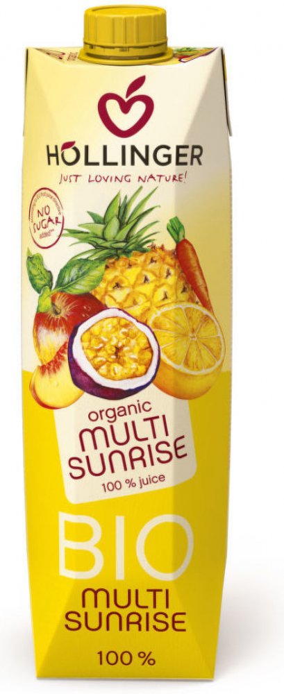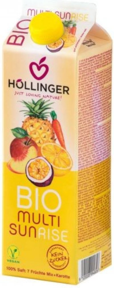 Složení: Ovocná šťáva * z koncentrátu různých druhů ovoce a ovocná dužina* 90 % (jablka*, pomeranče*, ananas*, broskve*, mango*, maracuja*, citron*), mrkvová šťáva z koncentrátu* 10 %. *produkt kontrolovaného ekologického zemědělství.