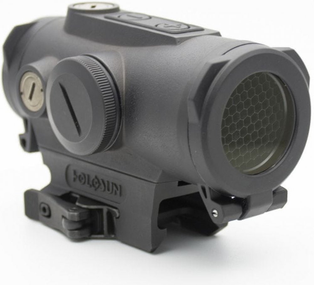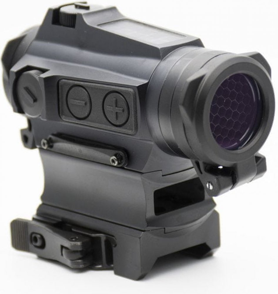 Malý hliníkový kolimátor se solárním panelem a přepínatelnou osnovou je vybavený průhlednými odklopnými FLIP-UP krytkami, , KillFlashem a nízkou a vysokou montáží v balení.
