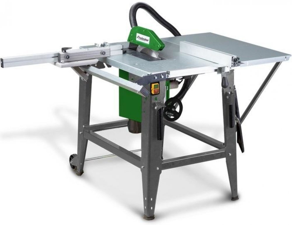 Vhodná pro domácí dílnu i na stavbu. Velký, pozinkovaný ocelový stůl. Pilový kotouč lze snadno naklopit v rozsahu 0 – 45°. Pilový kotouč lze výškově nastavit pomocí ruční kliky a stupnice. Velký hliníkový podélný doraz s excentrickým upínáním, lze jej použít také jako úhlový doraz. Kolečka a výklopné rukojeti usnadňují přepravu. Pila se dodává rozmontovaná.