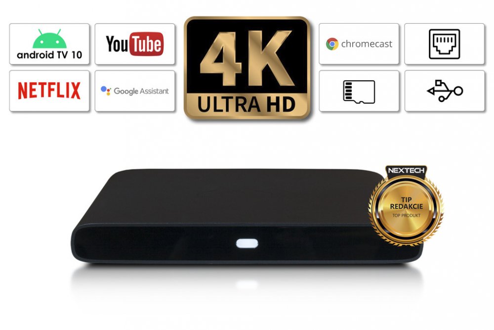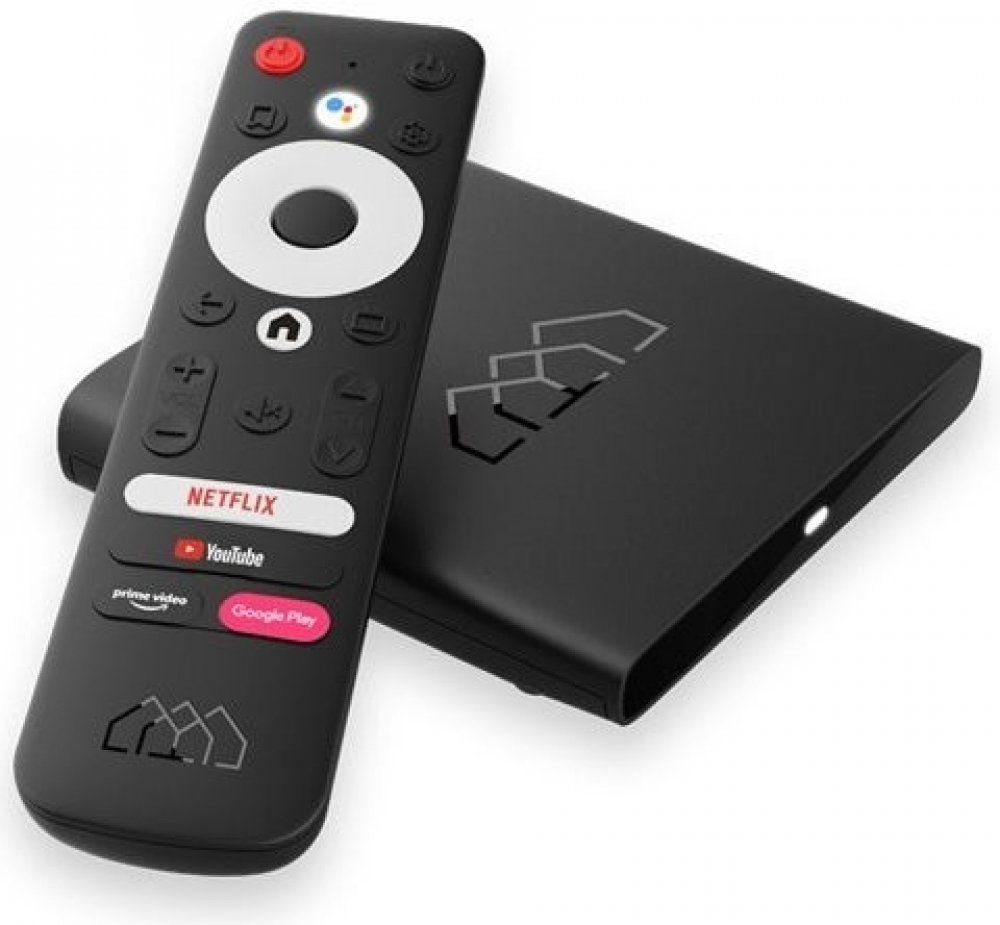 Obsahuje hlasového asistenta Google, předinstalovaný YouTube, Netflix, Google Play, Prime Video, zabudovaný chromecast a podporuje nejpoužívanější aplikace jako například KODI, HBO GO, Antik TV, Magio GO, Skylink a další. Dálkové ovládání slouží také jako mikrofon pro hlasového asistenta Google.