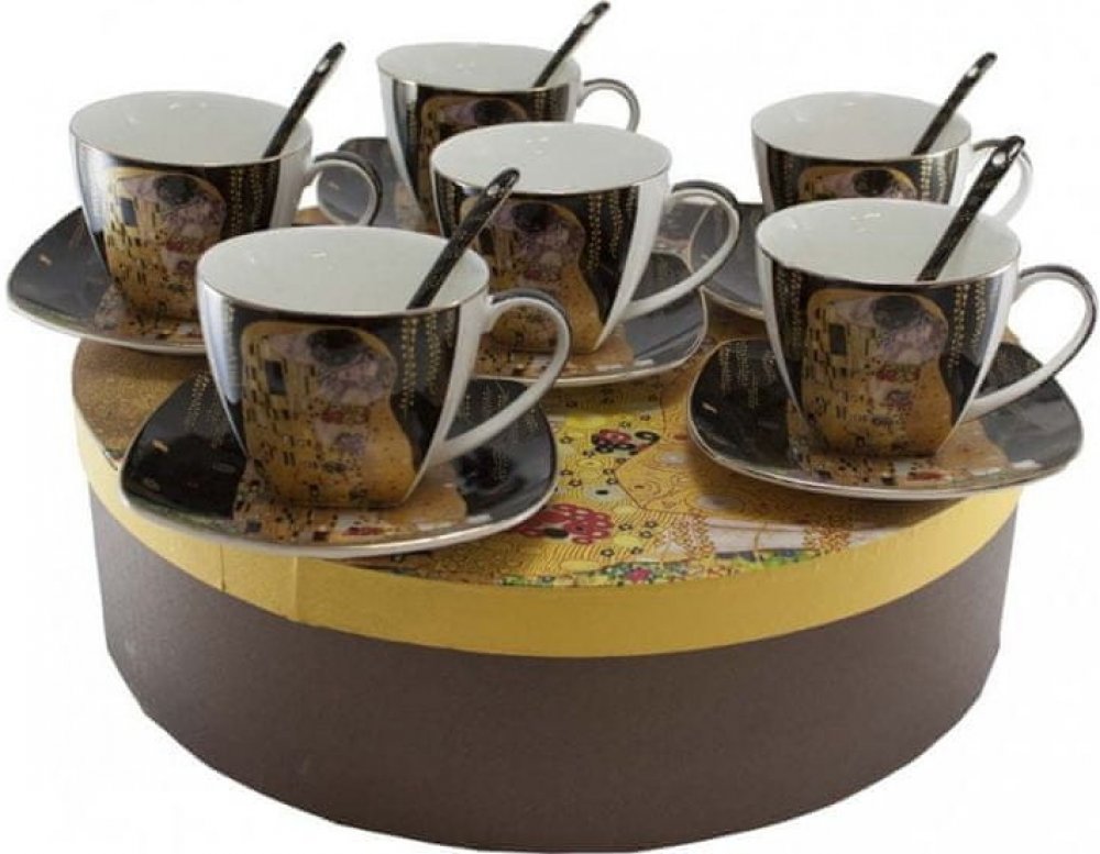 HOME ELEMENTS 6 ks šálky s podšálky a lžičkami Klimt Polibek tmavý 250 ml