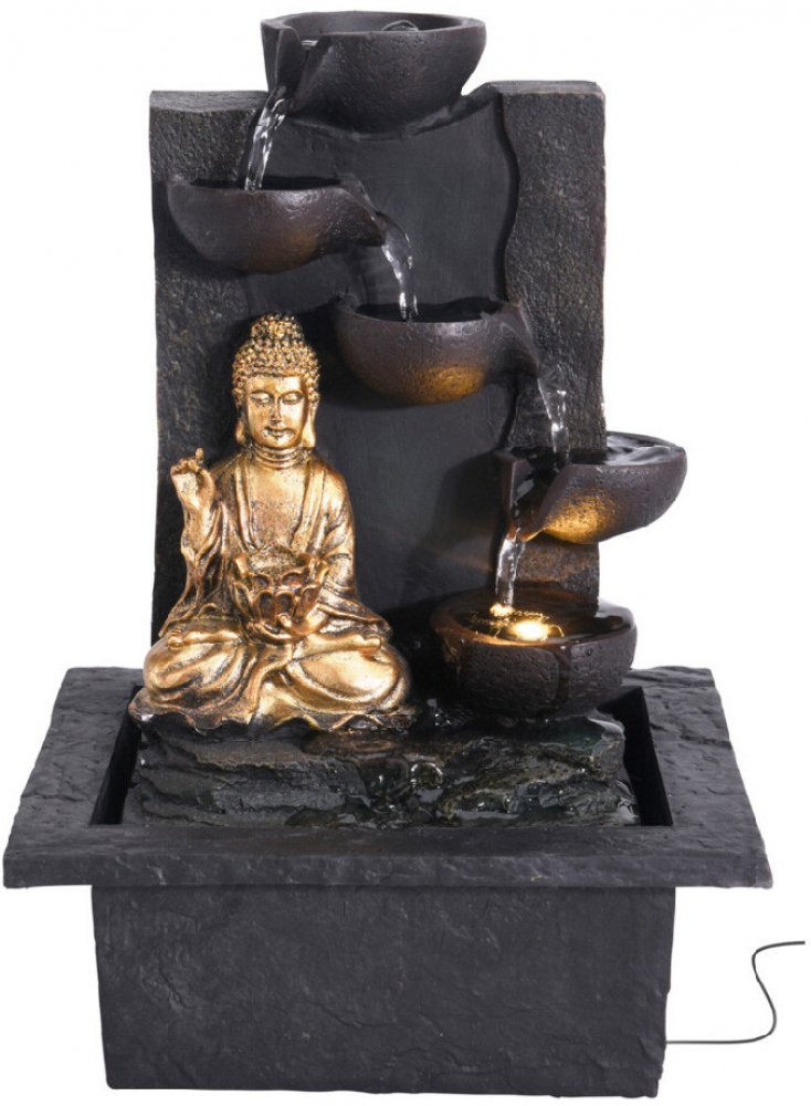 Fontána Buddhy z umělého kamene s LED páskem o délce 1,5 m bude pěkným doplňkem v interiéru, kde vytvoří dokonalé místo k relaxaci. Dodá místu harmonii a styl. Svítí v teplé bílé barvě.