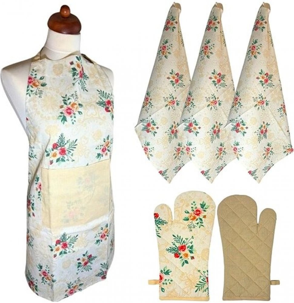 Výhodný kuchyňský set obsahuje nejdůležitější, nepostradatelné pomocníky při vaření - slušivou zástěru, chňapku a 3 utěrky. Vše s potiskem kytiček na světlém pozadí.