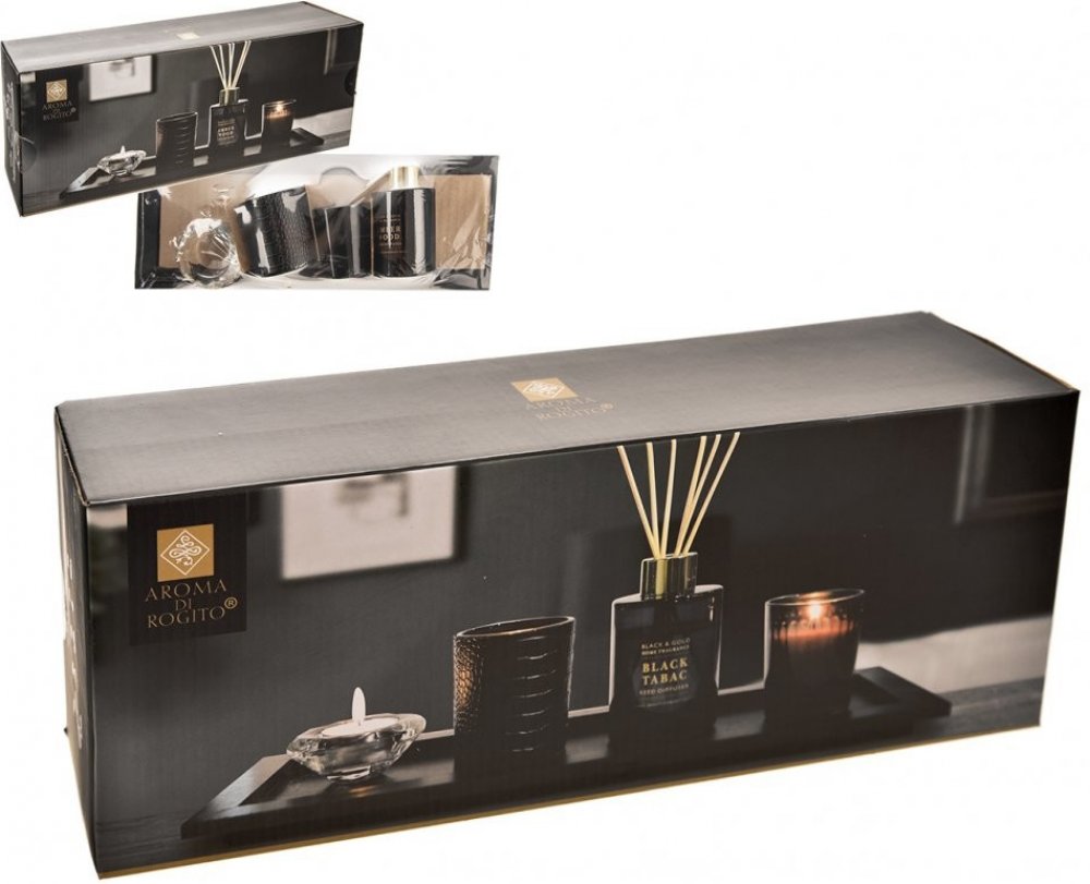 sada obsahuje: diffuser, svíčka ve skle, 2 x skleněný svícen, drevěný podnos