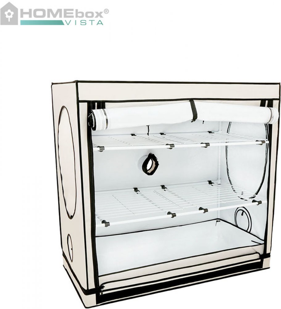 Elegantní Homebox Vista Medium je podobný například konkurenčním Dark Propagator od Secret Jardin a konstrukčně vychází ze staršího Cloneboxu. Moderní zpracování tohoto stanu nabízí zajímavé řešení pro vyplnění nevzhledného nebo neobsazeného prostoru v bytě opravdu efektivním způsobem. Hlavní výhodou je možnost rozdělit stan pomocí poliček na tři pěstební plochy. Stan na pěstování Vista Medium samozřejmě splňuje ty nejnáročnější požadavky pěstitelů ale i hospodyněk a kuchařek. Kdo by nechtěl neustále čerstvé bylinky?! Spolehlivou tradicí stanů Homebox je stabilní kovová konstrukce, odolné neprůsvitné zipy a pevné spoje. Vysoce kvalitní odrazová fólie PAR+ zvyšuje odraz světla a tak podporuje růst rostlin pod umělým osvětlením. K nepřetržité kontrole bez častého porušení vnitřního mikroklimatu napomáhají přední a dvě postranní okna. Rostlinky tak budete mít stále pod dohledem. Ideální ventilaci obstarají otvory na přítah/odtah o průměrech 100mm (dva vzadu), 200mm (jeden nahoře). Světlý growbox Homebox Vista Medium je určen pro pěstování rostlin nebo sazenic pod osvětlením s nižší wattáží. Stan nabízí pěstební prostor o rozloze 2,4 m2. Konstrukční nosnost 40kg Rozměry 125x65x120cm Všechny produkty Homebox jsou zdravotně nezávadné a garantují bezpečnou a úspěšnou kultivaci rostlin. Stan je po uzavření zcela neprůsvitný.
