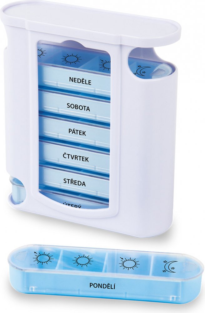 - přehledné a jednoduché vyjímání denních dávek- spolehlivý, praktický- 7 denních dávkovačů s popisem- 4 přihrádky