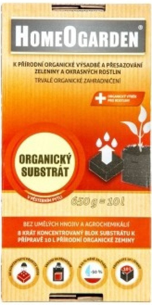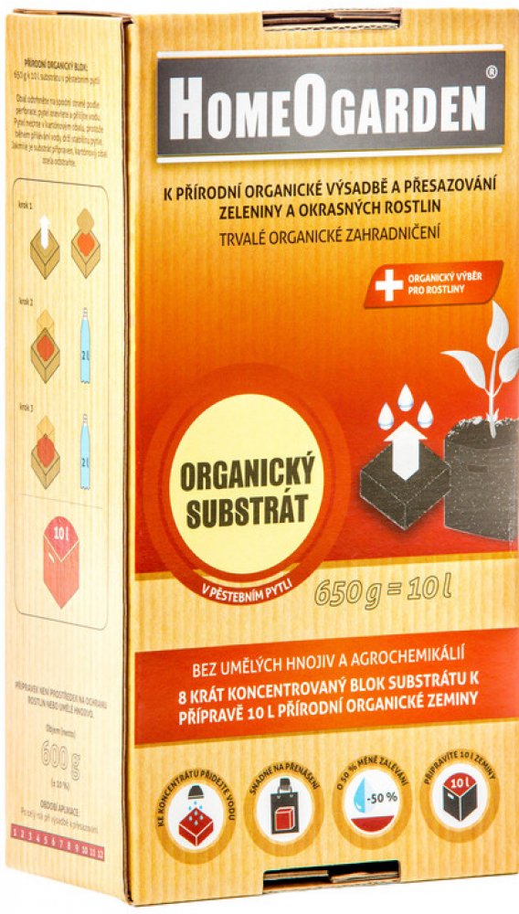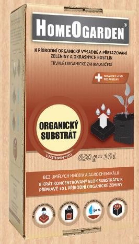 PŮSOBENÍ: Přirozeně, organicky a trvale používáme k setí, výsadbě a přesazování všech druhů rostlin. Používáme ho ke zlepšování zeminy, protože díky své jedinečnosti zlepšuje vodní – vzduchový režim v půdě a zeminu velice nakypří a zvýší tak zadržování vody v půdě a zemině. Substrát je mimořádně lehký a neobsahuje žádné nebezpečné příměsi, neboť k němu sami přilijeme pitnou vodu nebo dešťovku, když ho připravujeme. POUŽITÍ: K setí, výsadbě a přesazování všech druhů rostlin, k míchání s horšími zeminami a substráty, při sázení různých rostlin jako jsou okrasné rostliny, koření a všechny druhy zeleniny. ZPŮSOB POUŽITÍ: Setí, výsadbu, přesazování do substrátu můžeme realizovat po celý rok. Obal otevřete na spodní straně podle perforace a pytel otevřete. K organickému substrátu v pytli jednoduše přilijeme 4 l vody, což jsou přibližně 2 plastové láhve od nápojů (po 2 l). Doporučujeme použít teplou vodu, protože tak zeminu připravíte mimořádně rychle. Před přiléváním vody nechte pytel ve spodní části kartónového obalu a dle potřeby ho opřete o stěnu, aby se během přidávání vody nepřevrhnul. Vodu přilívejte postupně, nejprve 1 plastovou láhev a chvíli počkejte, až se blok řádně navlhčí. Poté přidejte zbývající vodu. Voda blok substrátu rychle navlhčí, organický substrát je tedy připraven přibližně za 10-15 minut. Dle potřeby můžete na konci rozpouštění i smíchat nebo prohníst se zeminou, aby se zemina navlhčila rovnoměrně. Jakmile je zemina připravena, kartónový obal zcela odstraňte. Podstatnou výhodou je, že domů nenosíte těžký obyčejný substrát, ale připravíte si ho sami. U substrátu představuje větší část voda, která však není vždy čistá a nezávadná, proto je důležité vědět, co jste přidali, pokud chcete organické zahradničení. Organický substrát používejte všude, kde chcete zlepšit kyprost a vzdušnost vaší půdy a snížit potřebu zalévání až o 50 %. Pokud organický substrát používáte k přímé výsadbě, přidejte před setím, výsadbou nebo přesazováním přírodní organické hnojivo a to HomeOgarden Organická Zahrada v množství 100 g na 10 l pytel. Rostliny tak budou mít dostatek živin pro normální růst. Dle potřeby ještě přihnojujte HomeOgarden Organickým Přihnojováním. Doporučujeme vám používat výhradně přírodní organická hnojiva, protože i substrát, který jste zakoupili, je zcela přírodní a organický. Během zalévání dávejte pozor, abyste zalévali podstatně méně než obvyklé substráty, protože výrobek velice dobře udržuje vodu a vláhu, což je podstatná výhoda.