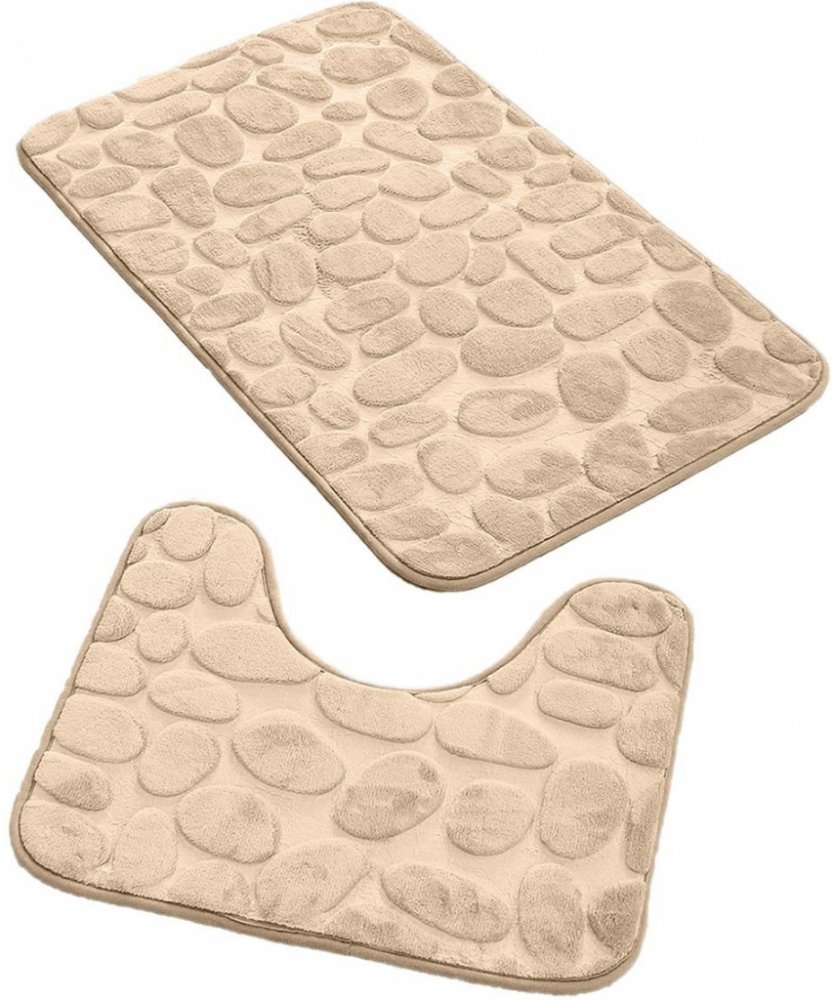 Perfektní koupelnová sada s příjemnou texturou. Set se skládá ze dvou koberečků - klasického koupelnového koberečku před vanu nebo sprchový kout a koberečku k záchodu. Účinně absorbuje vlhkost a podlaha v koupelně zůstane suchá, ušetříte si další úklid. Díky použitému materiálu jsou koberce měkké, pružné a příjemné na dotek. Mají také tu vlastnost, že si pamatují tvar našich nohou. Speciální PVC povlak zajišťuje jeho protiskluzové vlastnosti.Specifikace: