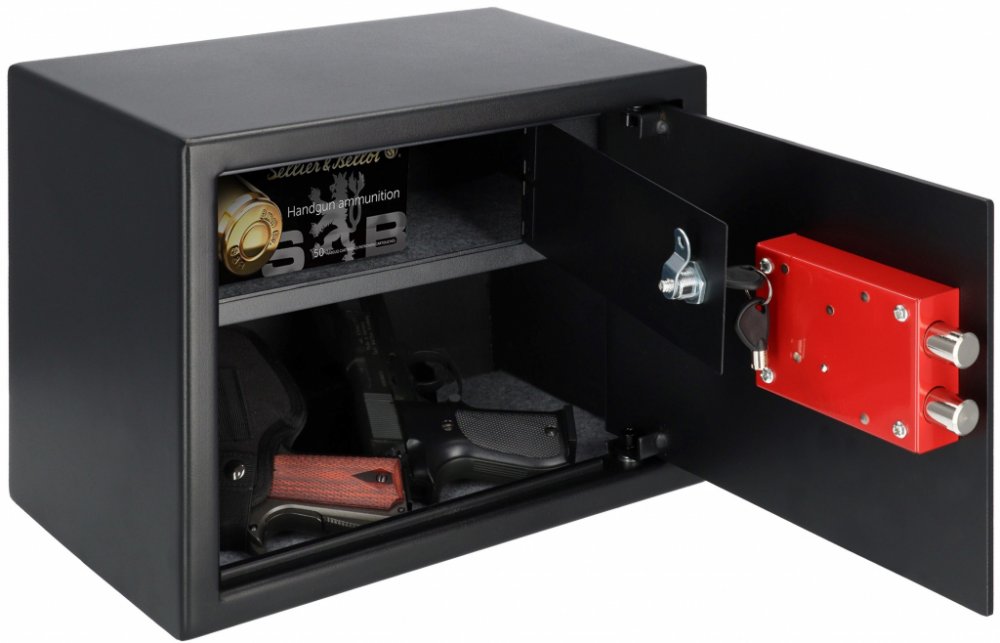 Uvnitř trezoru je samostatná uzamykatelná schránka s mechanickým zámkem (2 klíče), vhodná pro uložení střeliva. Trezor je opatřen kobercem, aby nedošlo k poškrábání předmětů.