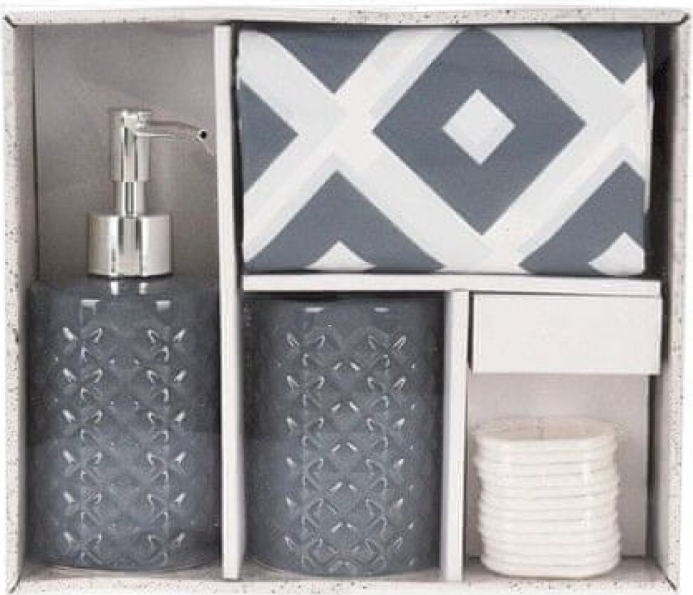 - set koupelnových doplňků v šedé barvě- vyrobené z keramiky s lesklou glazurou, závěs z PEVA- v sadě najdete také 12 háčků pro jednoduché připevnění závěsu- rozměr sprchového závěsu 180 x 180 cm- sada obsahuje 3 ks- dávkovač na mýdlo- držák na zubní kartáčky- sprchový závěs + 12 x háček na závěs- barva: šedá / bílá- značka: Homestyling