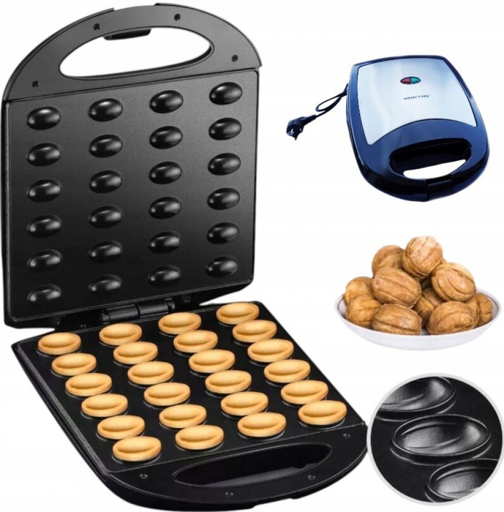 Zařízení společnosti Hometime pro pečení sušenek ve formě půlek oříšků naplněných krémem podle libosti sladkým nebo slaným. Velikost XL umožňuje upéct v jednom cyklu až 24 půlek oříšků. Bakelitové pouzdro, tepelně izolované rukojeti a nepřilnavá povrchová úprava varné desky činí používání výrobku pohodlným. Výkon 1300 W umožňuje efektivní upečení jedné várky sušenek během maximálně 2 minut. Kontrolka umožňuje průběžně dohlížet na proces pečení a připravovat další dávky sušenek. Díky protiskluzovým nožičkám je zařízení stabilní na povrchu.