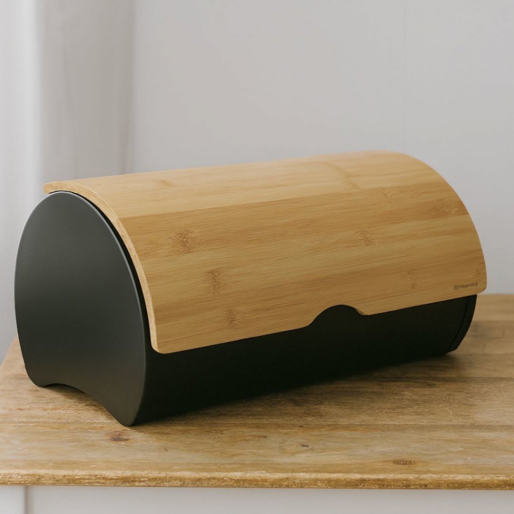 - Moderní a stylový chlebník s matně černým tělem a posuvným víkem z přírodního bambusu je ideálním řešením pro uchovávání pečiva.