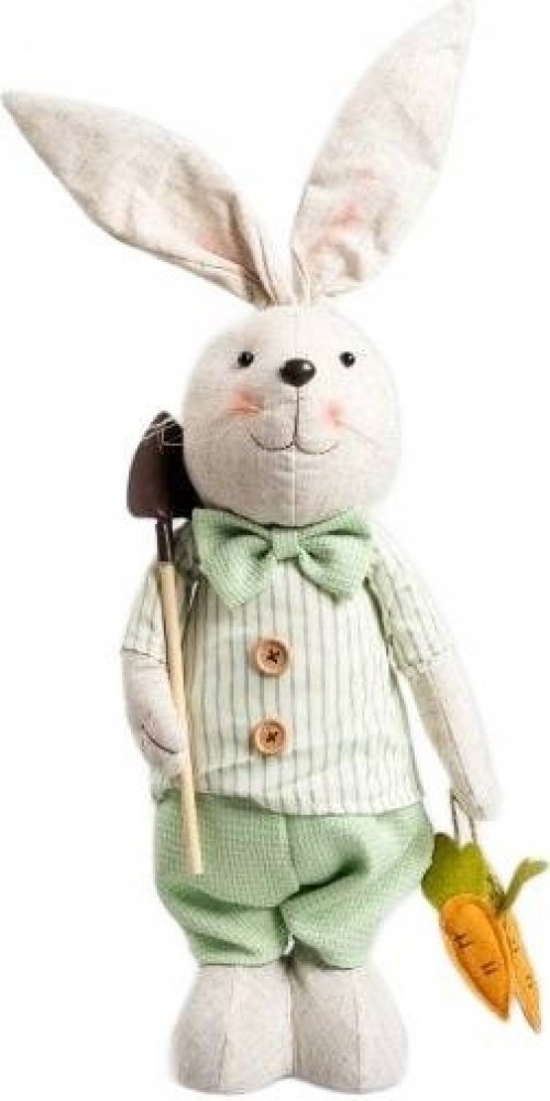 Králík JOLY je jedinečná dekorace, která vnese do vašeho domova radostnou jarní atmosféru. Oblečený v zelené košili, drží v rukou mrkev a lopatku, což mu dodává zvláštní kouzlo. Díky své výšce 72 cm se skvěle hodí jako ústřední prvek velikonoční kompozice na stole, komodě nebo u okna.
