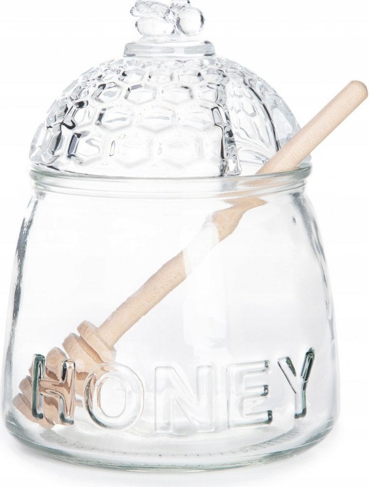 Skleněná nádoba s víkem HOMLA REGEL pro skladování medu. Nádoba s otvorem o velkém průměru (8 cm) umožňuje snadné plnění tekutým medem a jeho vytahování lžící, když silně krystalizuje. Kryt je zdoben motivem včelího plástu a úchytem ve tvaru figurky včely. Otvor ve víku umožňuje uzavřít nádobu s dřevěnou paličkou ponořenou v medu.