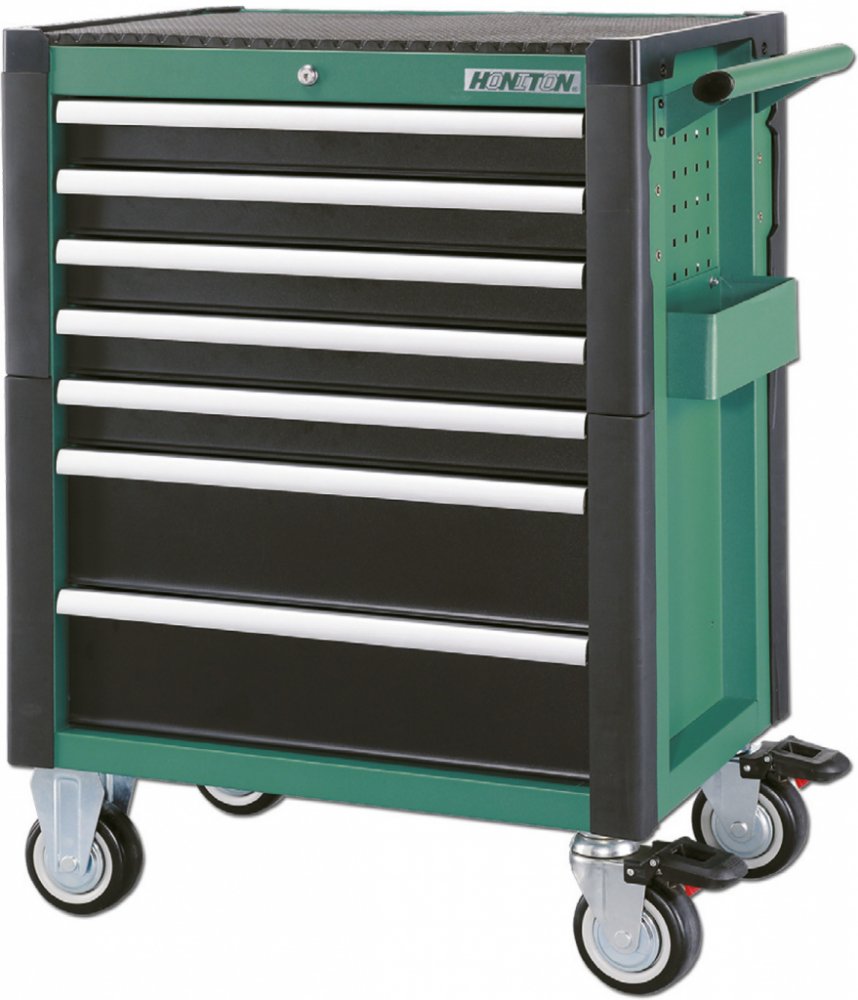 Kovový montážní vozík na nářadí se 7 zásuvkami. Dvě pevná a dvě otočná kola s poziční brzdou. Zásuvky s kuličkovými ložisky lze vysunout do 40 cm. Horní pracovní plocha i zásuvky jsou vypodloženy protiskluzovou podložkou. Držadlo pro manipulaci s vozíkem lze umístit z pravé i levé strany. Součástí je 5 nízkých a 2 vysoké uzamykatelné zásuvky.