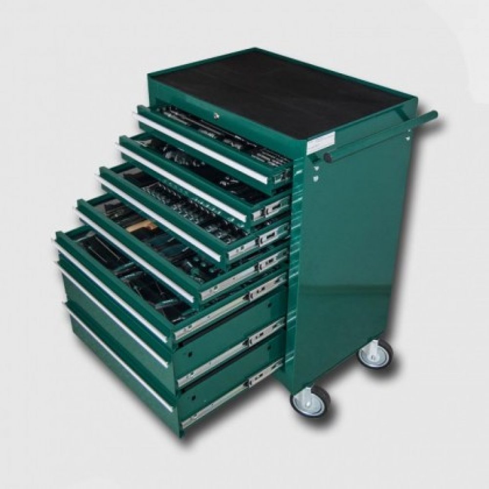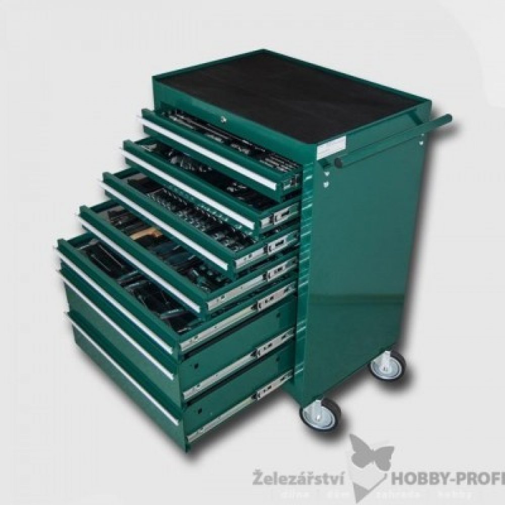 Kovový montážní vozík na nářadí se 7 zásuvkami. Dvě pevná a dvě otočná kolečka s poziční brzdou. Zásuvky na kuličkových ložiskách lze vysunout do 40cm. Horní pracovní plocha i zásuvky jsou vypodloženy protiskluzovou podložkou. Držadlo pro manipulaci s vozíkem lze umístit z pravé nebo levé strany. Součástí jsou uzamykatelné zásuvky (5 nízkých a 2 vysoké zásuvky).