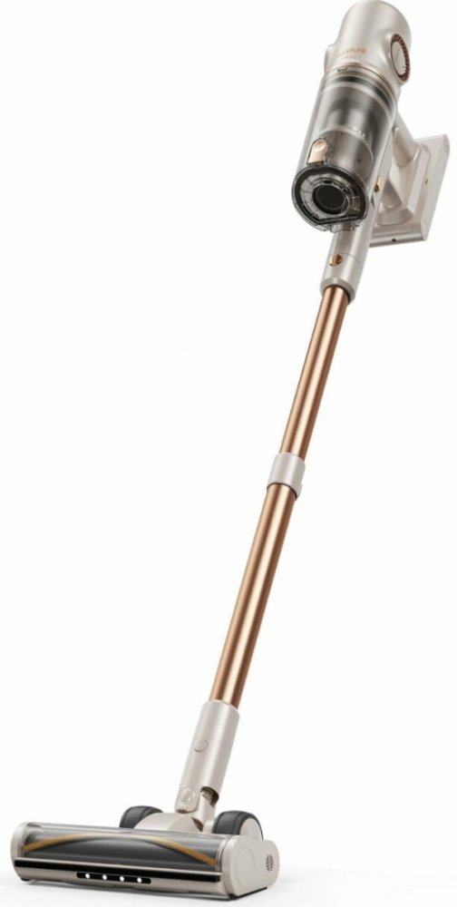 Vysavač je lehké konstrukce, samostatně stojí a zaujme elegantním designem v odstínu champagne gold. Nabíjení probíhá v nástěnném držáku, který zároveň slouží k praktickému uložení příslušenství. Na plné nabití zvládne uklidit až 300 m² a plně nabitý je přibližně za 4 hodiny.