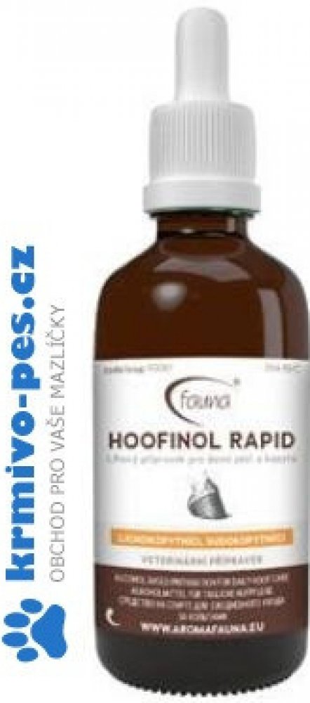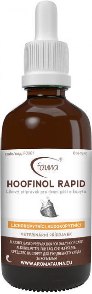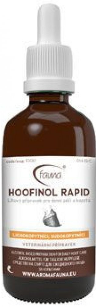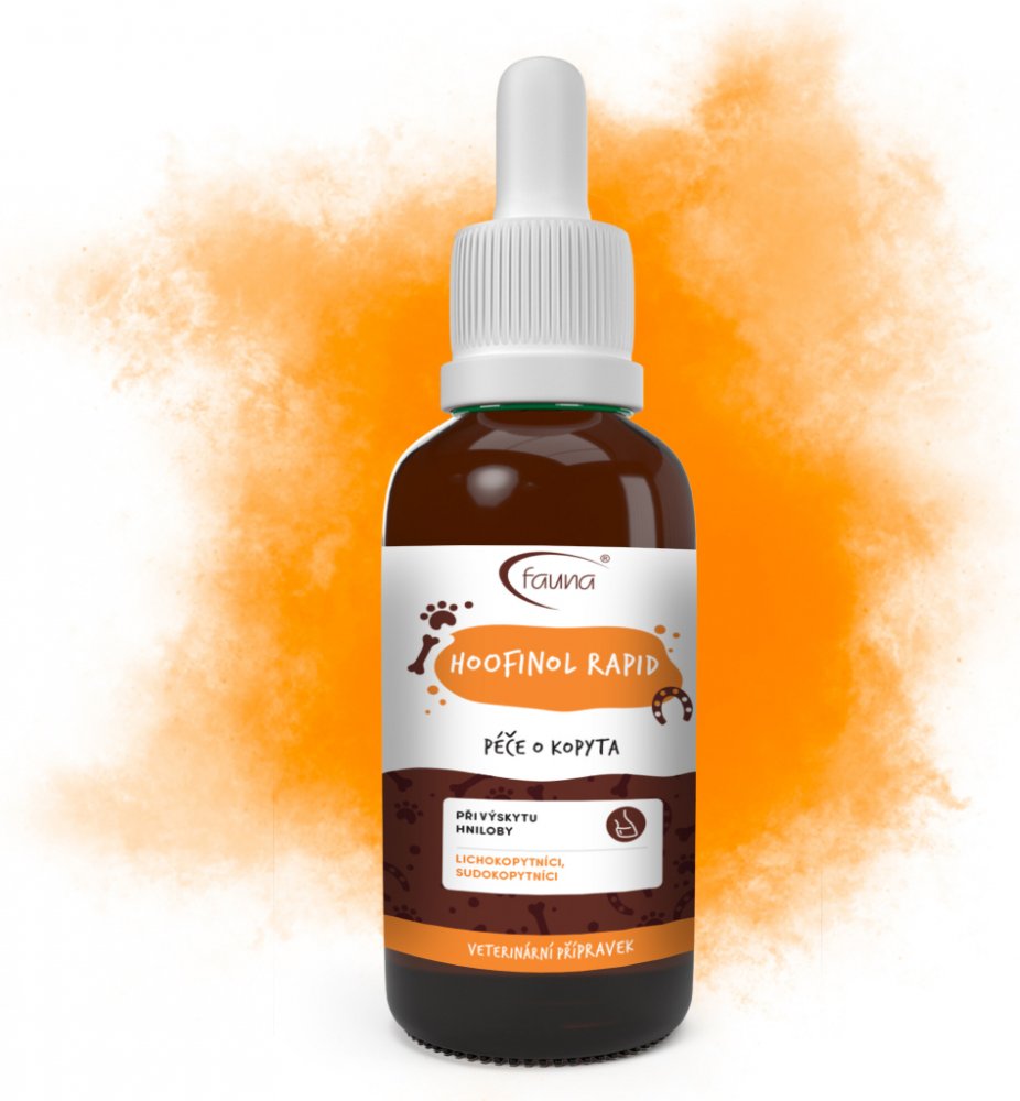 HOOFINOL RAPID k péči o kopyta 50 ml - Lihový přípravek s širokým spektrem účinku určený k desinfekci kopyt, použitelný k denní péči. Osvědčil se u kopyt trpících hnilobou. Při akutní „vlhké“ hnilobě dochází během několika dní k zasušení a zastavení procesu změny rohoviny. Líh a éterické oleje působí proti širokému spektru bakterií a plísní.
