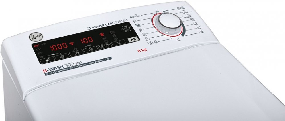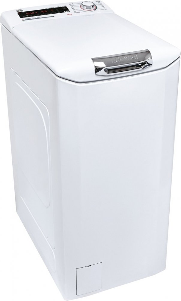 - Vrchem plněná automatická pračka H-WASH 300 Slim v bílém designu s chromovaným madlem