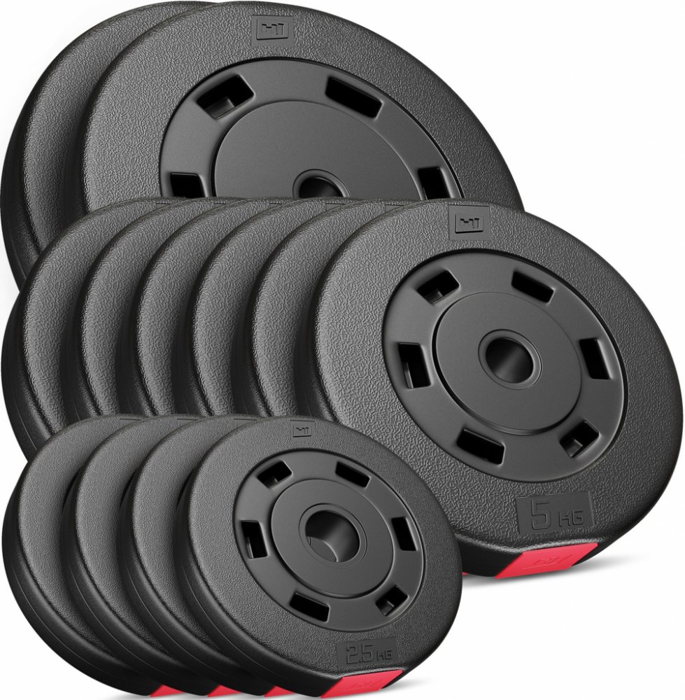 Cementová závaží 60kg (2x10kg, 4x5kg, 4x2,5kg, 8x1,25kg) jsou nezbytnou výbavou pro lidi, kteří začínají své dobrodružství se silovým tréninkem a pro ty, kteří oceňují dobrou kvalitu za nízkou cenu. Jejich vnější plášť je vyroben z vícevrstvého plastu, vyztužený přídavnými profily a vyplněn směsí písku a cementu. Tato struktura činí cementové kotouče odolné a nepoškrábou podlahu. Navíc mají zkosen...