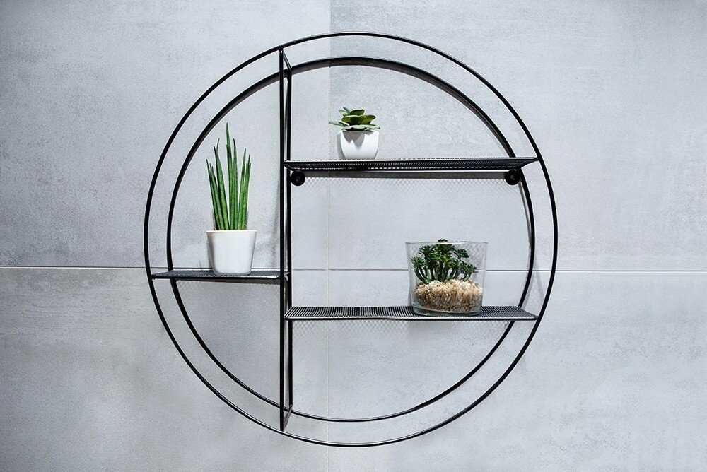 Nástěnná kulatá drátěná polička vyrobená z kvalitní oceli a lakovaná do černé barvy. kulatá polička obsahuje celkem 3 rovné, odkládací plochy. K instalaci je nutností vrtání do stěn.Nástěnná kulatá drátěná polička vyrobená z kvalitní oceli a lakovaná do černé barvy. kulatá polička obsahuje celkem 3 rovné, odkládací plochy. K instalaci je nutností vrtání do stěn.