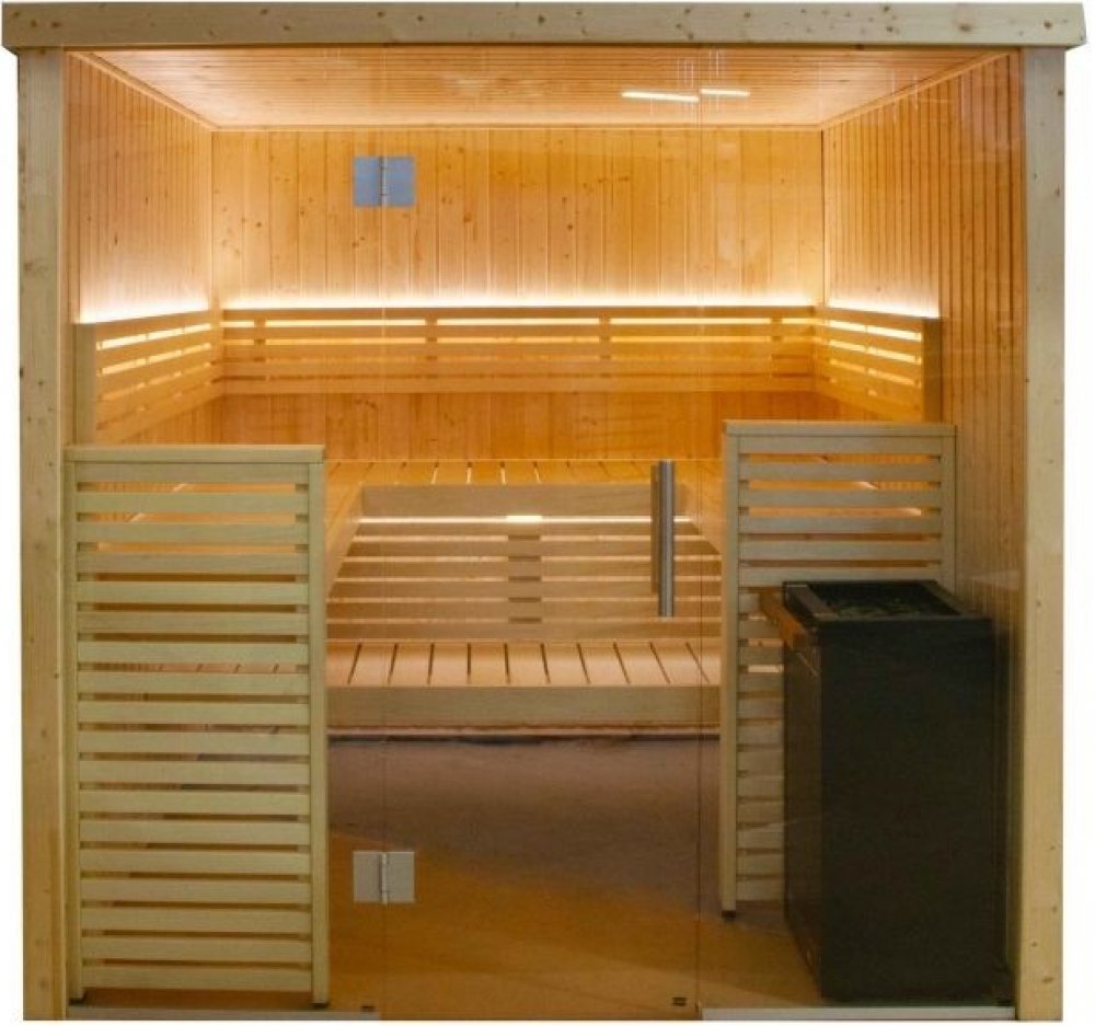 Sauna Harvia - Finská sauna HARVIA Vario View o rozměrech 2060x2033x2016 mm je určená pro rodinné použití. Výhodou je její velká prosklená přední část, která propouští přirozené světlo a působí vzdušně a elegantně. Saunové lavice jsou vyrobeny z osikového dřeva, strop a stěny sauny z masivního smrkového dřeva.