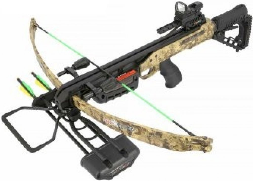 Sada reflexní kuše Hori-Zone Rage Elite Stejně jako u předchůdce této kuše lze Rage Elite sestavit a rozložit v několika jednoduchých krocích. Další funkce: lehká, vysoce kvalitní pažba ve stylu AR (délka je nastavitelná) automatická aktivace pojistky ochrana proti výstřelu naprázdno rychlá a snadná montáž a demontáž Technické údaje: Síla tahu: 185 liber Rychlost šípu: 275 fps (cca 303 km/h) Zdvih (Power Stroke): 11“ Délka (prodloužitelná pažba): 79-85 cm Šířka (v povoleném stavu): cca 68cm Hmotnost: 4,8 lb (cca 2,2 kg) Rozsah dodávky: Kuše HORI-ZONE Rage Elite Přídavný toulec Mířidlo Halo Style Red Dot Talonová pomůcka na natahování 2 hliníkové šípy (16“) Lubewax