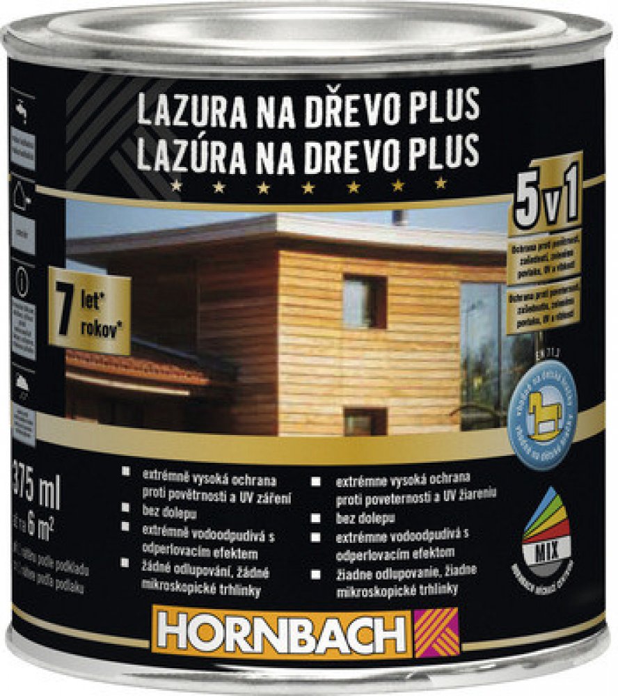 Lazura na dřevo HORNBACH Plus je inovativní, ekologická lazura s polyuretanovou příměsí pro venkovní oblast, která v sobě spojuje všechny výhody lazury obsahující rozpouštědla a lazury na vodní bázi. Informace o výrobku lazura na dřevo HORNBACH Plus Lazura je vhodná pro všechny rozměrově stálé i nestálé dřevěné díly ve venkovní oblasti, jako např. okna, dveře, zahradní nábytek, prvky pohledové ochrany, zahradní domky, hrací zařízení a jiné dřevěné povrchy. V systému s protiskluzovou příměsí Hornbach vhodné také pro dřevěné podlahy. Lazura na dřevo poskytuje dlouhodobou ochranu 7 let. Na světle stálé mikropigmenty zajišťují vysoký stupeň ochrany proti UV záření. Nátěr je elastický, neodkapává, reguluje vlhkost, je propustný, extrémně vodoodpudivý a poskytuje vynikající ochranu proti povětrnostním vlivům. Bez odlupování, mikrotrhlin, optimální vlastnosti pro natírání. Před použitím dobře protřepejte. Podklad musí být čistý, suchý, bez oleje, mastnot a musí být nosný. Dřevo smí obsahovat max. 15% vlhkost. Dřeva s vysokým obsahem pryskyřice a mastné zbytky omyjte univerzálním ředidlem. Renovační nátěr: Odstraňte uvolněné části odlupujícího se starého nátěru, zvětralý nátěr obruste až na zdravé dřevo. Nepoškozený starý nátěr obruste. Naneste dvě vrstvy lazury na dřevo Plus ve směru kresby dřeva. Nový nátěr: Naneste 2 – 3 vrstvy lazury na dřevo Plus ve směru kresby dřeva. Na plochy, které jsou intenzivně vystaveny působení podnebných vlivů, naneste 3 vrstvy. Neopracované a tlakově impregnované dřevo, náchylné na zamodrání (jehličnatá dřeva, splintové dřevo) předem ošetřete základním nátěrem na venkovní dřevo Hornbach. Tip: Plochy pravidelně kontrolujte a ihned opravujte malá poškozená místa na povrchu nátěru.