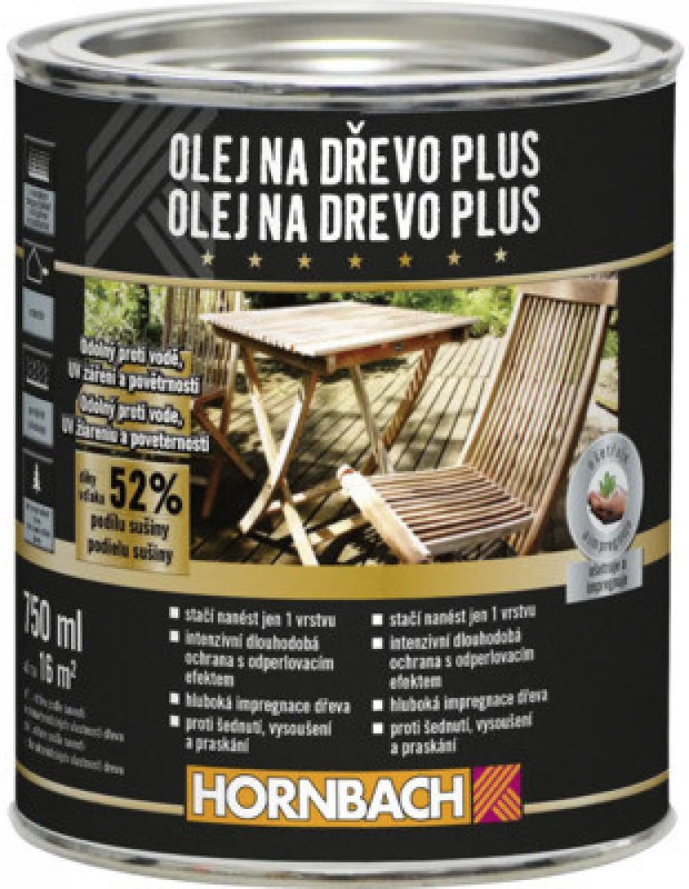 Olejový přípravek na vodní bázi s impregnačním účinkem optimalizovaný pro použití na dřevo. Díky vysokému podílu pevných částic 52 % nabízí olej na dřevo Plus spolehlivou dlouhodobou ochranu proti povětrnostním vlivům a UV záření. Voda se po dřevěném povrchu jednoduše odperlí. Zároveň ale zůstanou otevřené póry, povrch je i nadále prodyšný a reguluje vlhkost. Olej na dřevo Plus vytváří mimořádně odolný povrch odpuzující nečistoty a vodu, chrání dřevo před vyschnutím a zešednutím, zmírňuje tvorbu trhlin a neodlupuje se. Optimální pro oživení barevného odstínu, zdůrazňuje přírodní kresbu dřeva (ožíhání). Mimořádně snadné a rychlé zpracování: 1 nátěr stačí na úplnou ochranu.