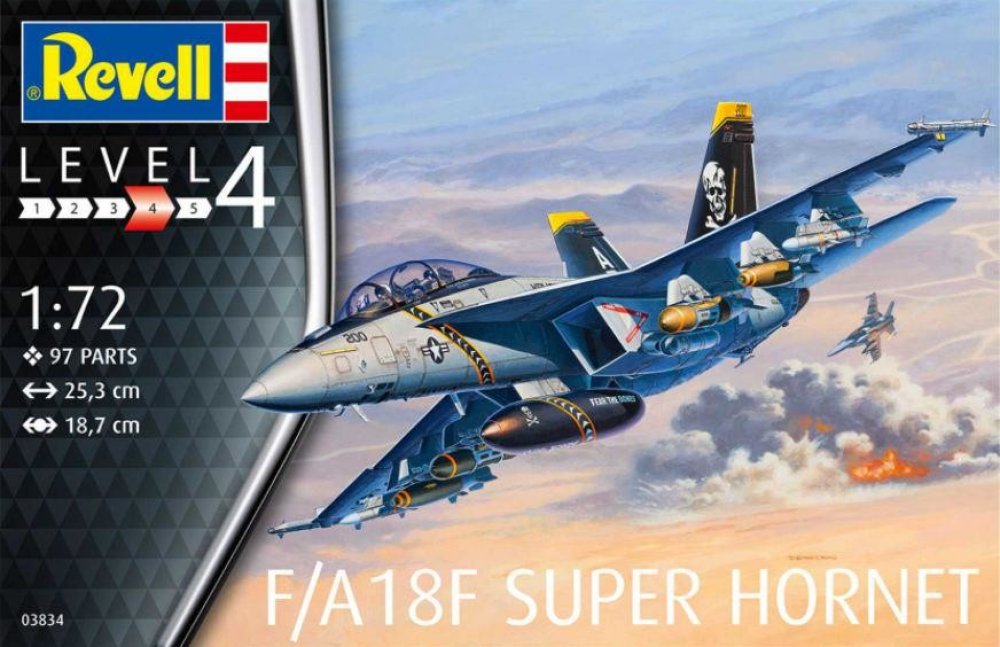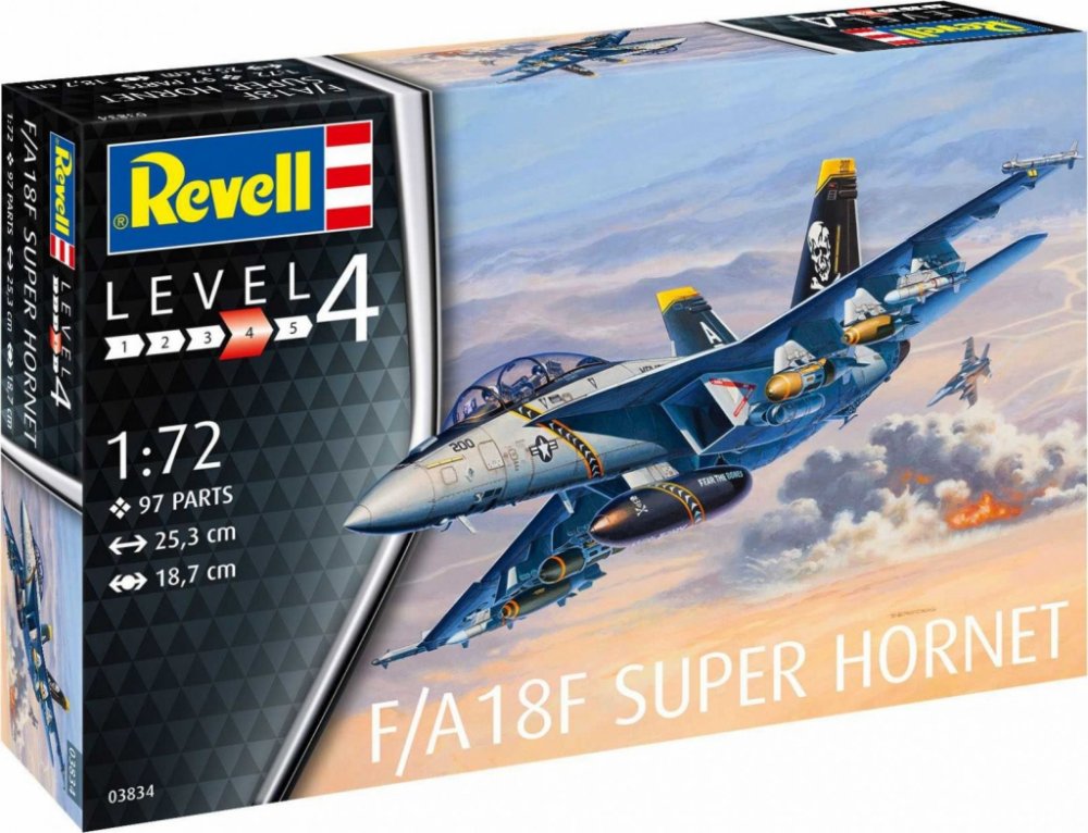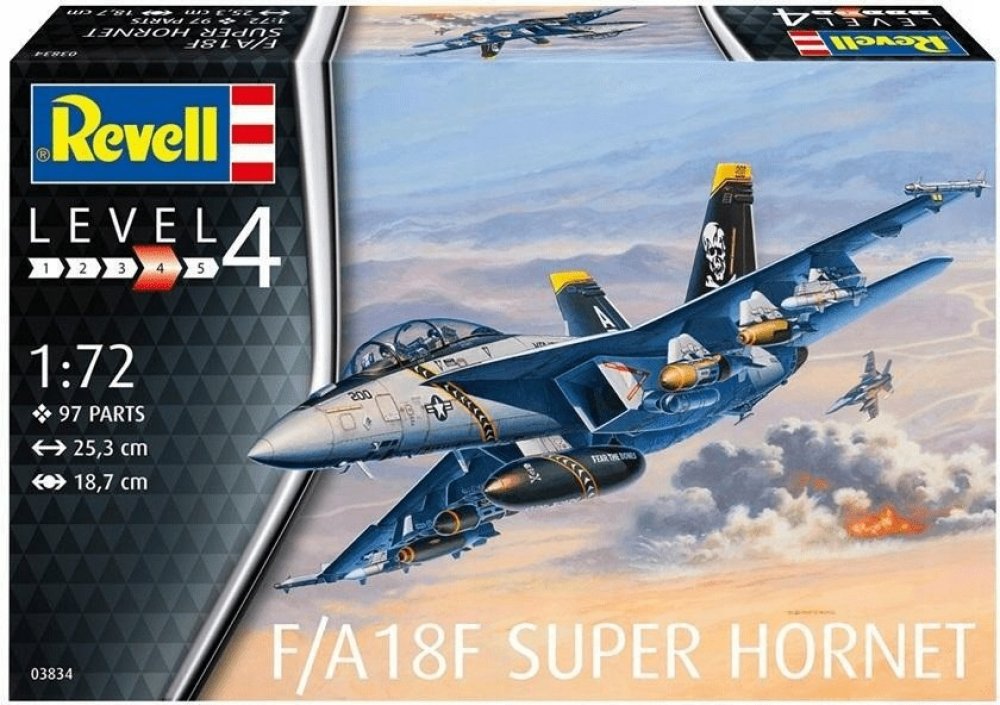 Plastikový model Revell 03834 – Boeing F/A-18F Super Hornet v měřítku 1:72 ke slepení. Stavebnice obsahuje 97 dílků, rozpětí křídel 189 mm, obtížnost 4.