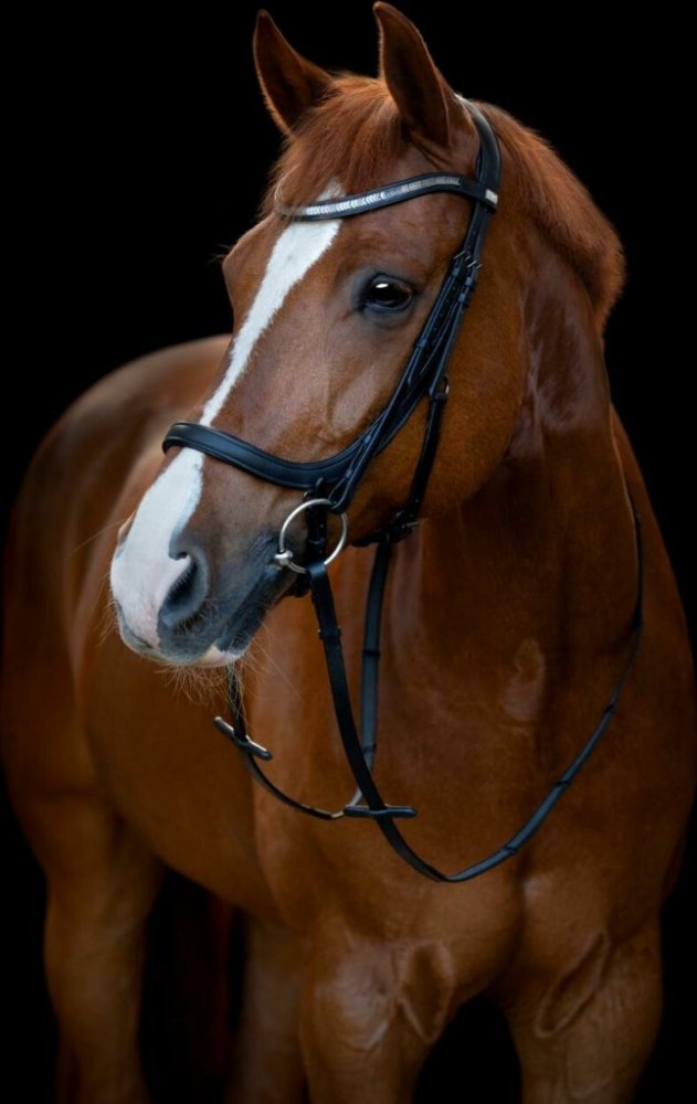 Kvalitní kožená uzdečka s anatomickým nánosníkem. Anatomický tvar nánosníku eliminuje tlak na ty nejcitlivější oblasti koňské hlavy a pomáhá držet udidlo ve stabilní pozici. Má měkké polstrování, anatomicky tvarovaný nátylník a čelenku zdobenou stříbrnými prvky. Dodávaná s 16 mm otěžemi, které jsou opatřeny protiskluzovou úpravou.