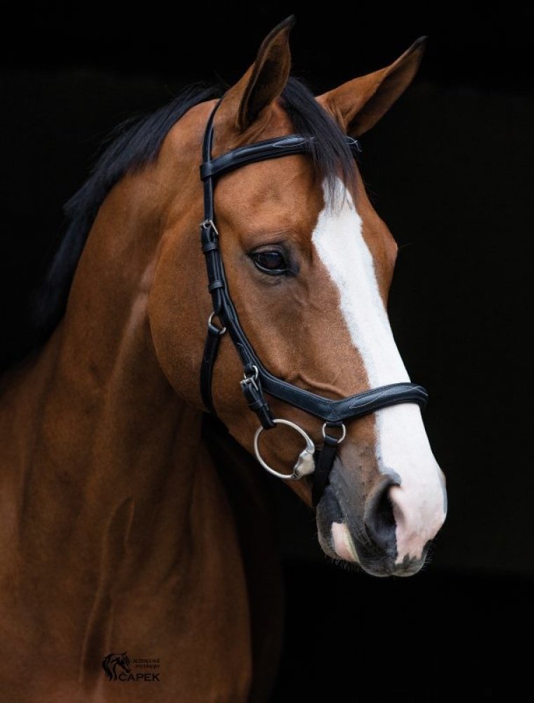 Anatomická uzdečka kopírující tvar lebky koně tak, aby nebyl vyvíjen tlak na pět citlivých míst na hlavě koně. Uzdečka je určena pro použití s udidlem. Vybavena širším nánosníkem a zdobena kontrastním prošitím.