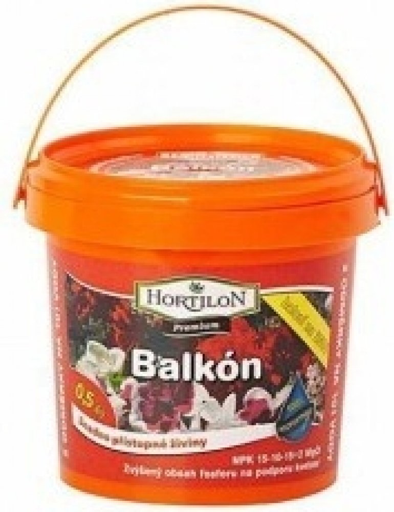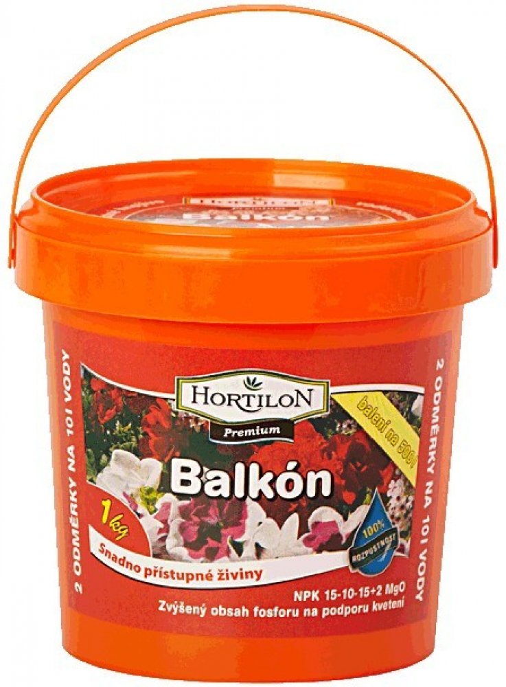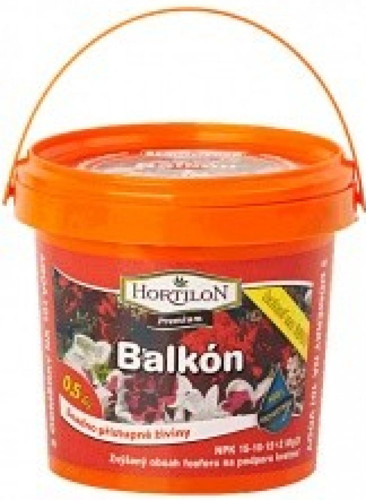 Krystalické hnojivo "Balkón", HORTILON je dodáváno v kbelíkách po 0,5 kg a 1 kg.