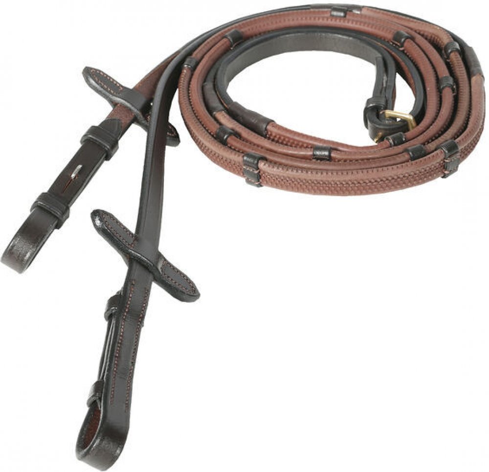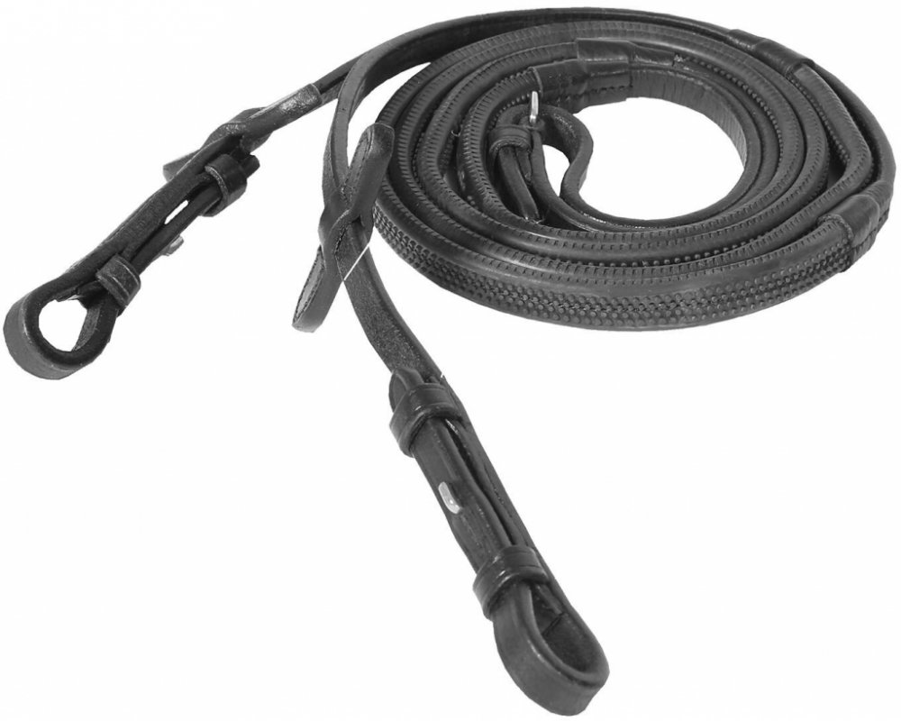 Měkké pryžové otěže zahrnují odsazené kožené zarážky pro ještě pevnější pevný úchop. Super užitečné při jízdě ve vlhkém počasí. Neproklouznou vám rukama v horkých dnech, kdy se vašemu koni potí krk. Jemné kožené akcenty a zarážky na otěžích jsou pěknými přidanými detaily. Háčkové a cvočkové nástavce na udidlo a uzávěry přezek jsou z nerezové oceli.