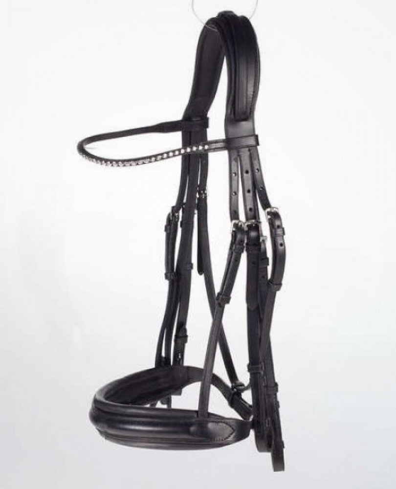 Tato skvělá uzda má jemnou čelenku s krásnými detaily. Tato skvělá uzda má jemnou čelenku s krásnými detaily. Hledáte uzdu se všemi detaily, které byste od vysoce kvalitního vybavení očekávali. Tato dvojitá uzda je správná volba. Kombinace dechberoucího designu a kůže nejvyšší kvality vytvořila nádhernou uzdu pro drezurní jezdce. Tmavě černá kůže a polstrovaná čelenka zvýrazní hlavu drezurní hvězd...