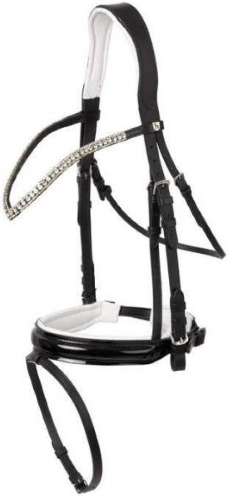 Klasická uzdečka s polstrováním, velmi slušivá a skvěle sedí. Anatomický nátylník s tvarovanými výřezy pro uši dodají pohodlí a snadné usazení. Polstrovaný švédský nánosník se snadno zapíná a skvěle sedí. Nádherná čelenka ve tvaru V má vkusnou řadu kamínků pro třpytivý efekt. Dodává se bez otěží!